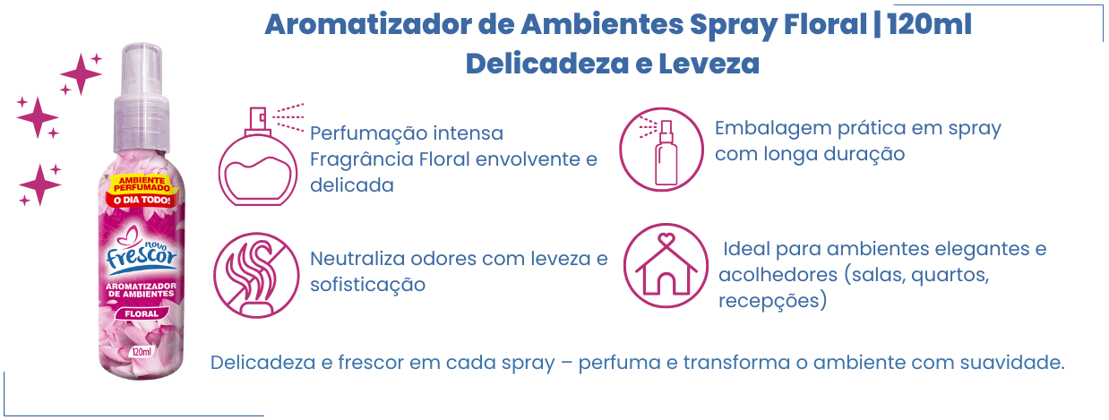 Transforme a atratividade do seu ponto de venda com a fragrância sofisticada e envolvente floral, que transmite frescor, aconchego e charme. Com alta fixação, o Aromatizador Spray Floral da Novo Frescor perfuma por horas, encantando consumidores e oferecendo ótimo giro no varejo.
