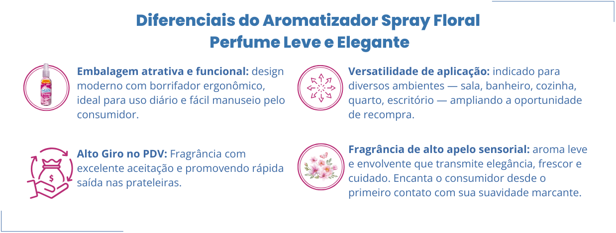Cada borrifada transforma o ambiente em um espaço agradável e sofisticado, perfeito para consumidores que buscam bem-estar e harmonia no dia a dia. Sua embalagem prática e moderna valoriza a exposição no ponto de venda, enquanto a alta aceitação da fragrância impulsiona as vendas e garante recompra recorrente.
