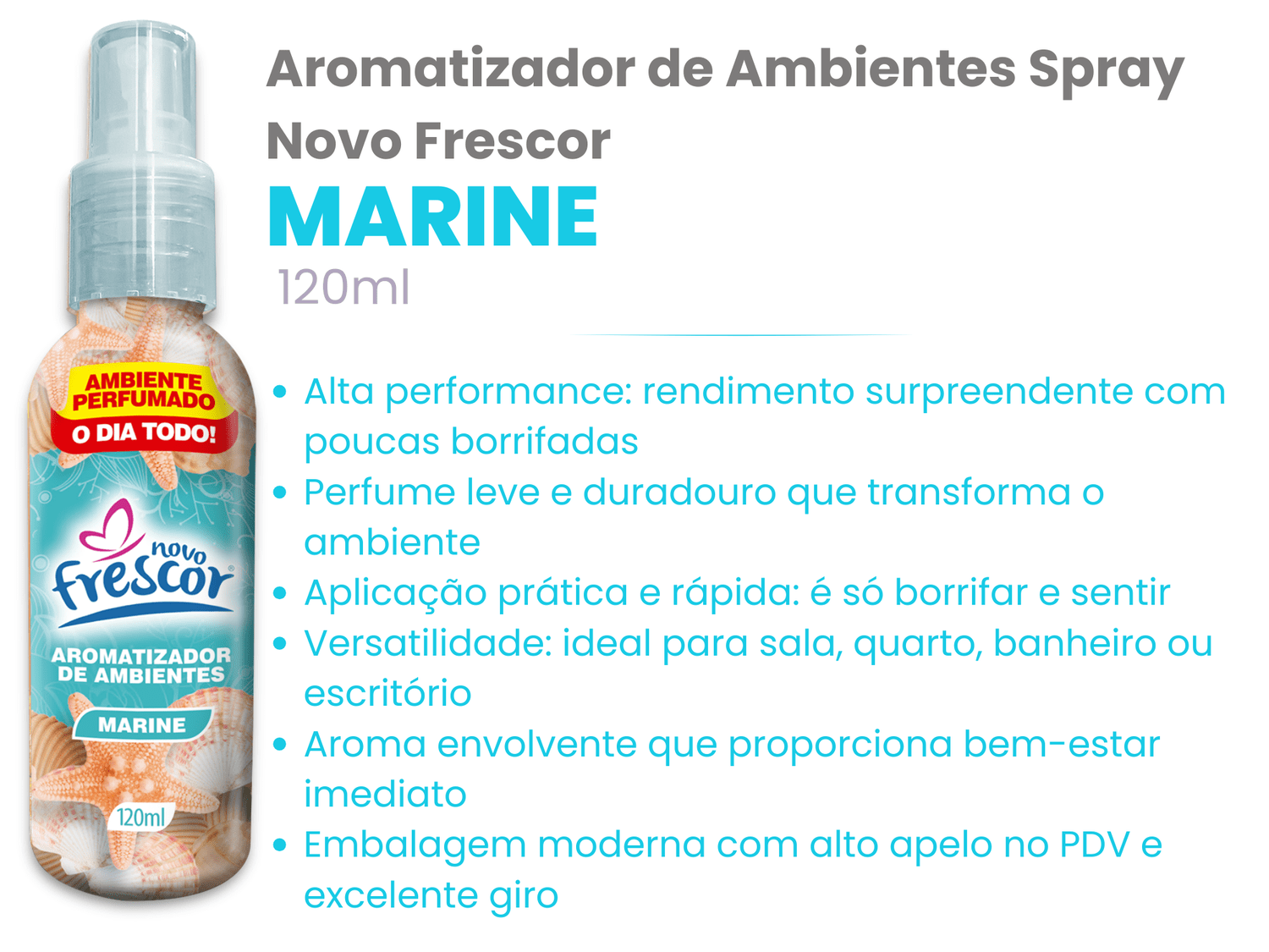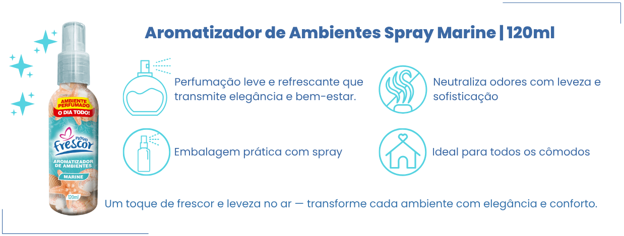 Torne o seu ponto de venda mais atrativo com a fragrância refrescante e revigorante Marine, que transmite sensação de limpeza, leveza e bem-estar. Com alta fixação, o Aromatizador Spray Marine da Novo Frescor perfuma por horas, sendo altamente aceito no varejo e um sucesso garantido em vendas e recompra.