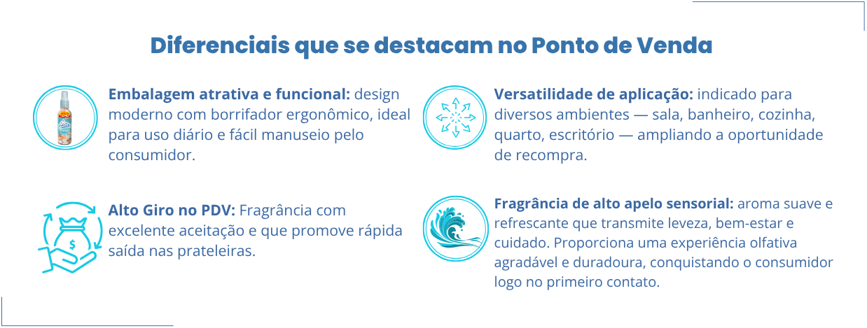 Cada borrifada cria um ambiente agradável, moderno e energizante, ideal para consumidores que buscam bem-estar e frescor prolongado. Sua embalagem prática e sofisticada valoriza a exposição no ponto de venda, enquanto a alta aceitação garante excelente giro e recompra frequente.