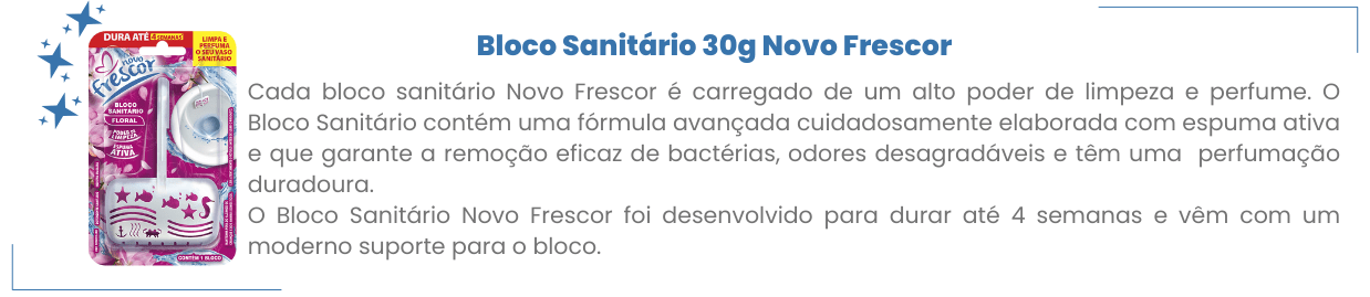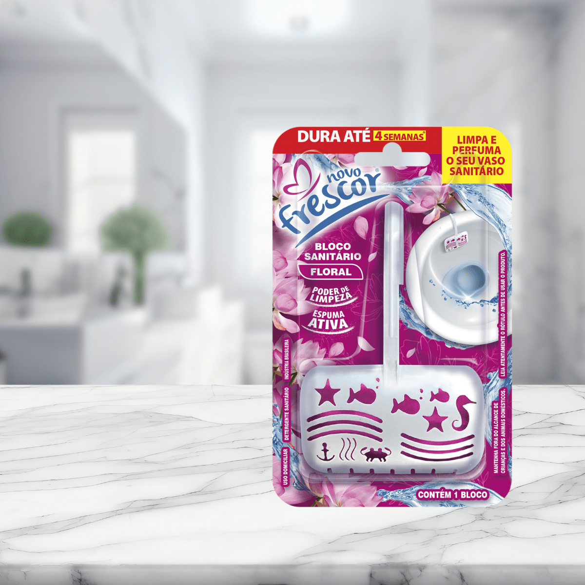 O Bloco Sanitário da Novo Frescor foi formulado com uma tecnologia, para que cada descarga seja uma experiência revigorante, deixando o vaso sanitário limpo, perfumado e com aquele frescor surpreendente. Além disso, ele é econômico e eficiente. Cada embalagem contém 1 bloco com 30 gramas e 1 suporte plástico, onde cada bloco tem duração de até 4 semanas.
