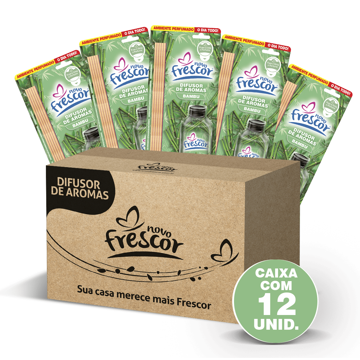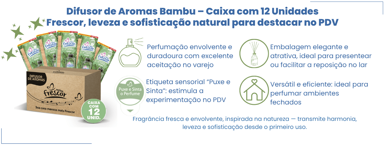 Ideal para revendedores e lojistas, a Caixa com 12 Unidades do Difusor de Aromas Bambu Novo Frescor combina frescor, leveza e elegância natural, oferecendo excelente custo-benefício e alta rotatividade no ponto de venda.
