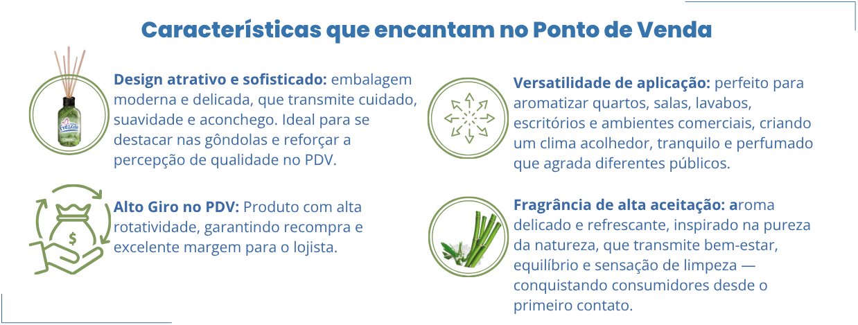 Com alta aceitação no varejo, perfumação duradoura e design contemporâneo, o Difusor Bambu é um grande aliado das vendas — e um item indispensável no mix de produtos de qualquer distribuidor.