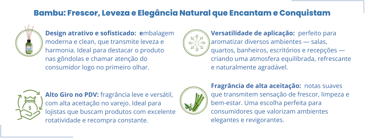 Com notas verdes e suaves, a fragrância de Bambu transmite frescor, harmonia e bem-estar, sendo ideal para consumidores que valorizam ambientes elegantes, acolhedores e com toque de natureza.