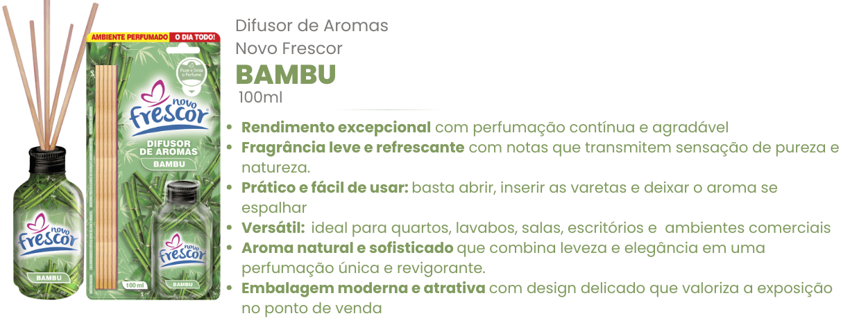 Ideal para lojistas e distribuidores que desejam oferecer produtos de excelente giro e alta aceitação no PDV, o Difusor Bambu valoriza a exposição, encanta pelo visual elegante e conquista o consumidor final desde o primeiro contato.