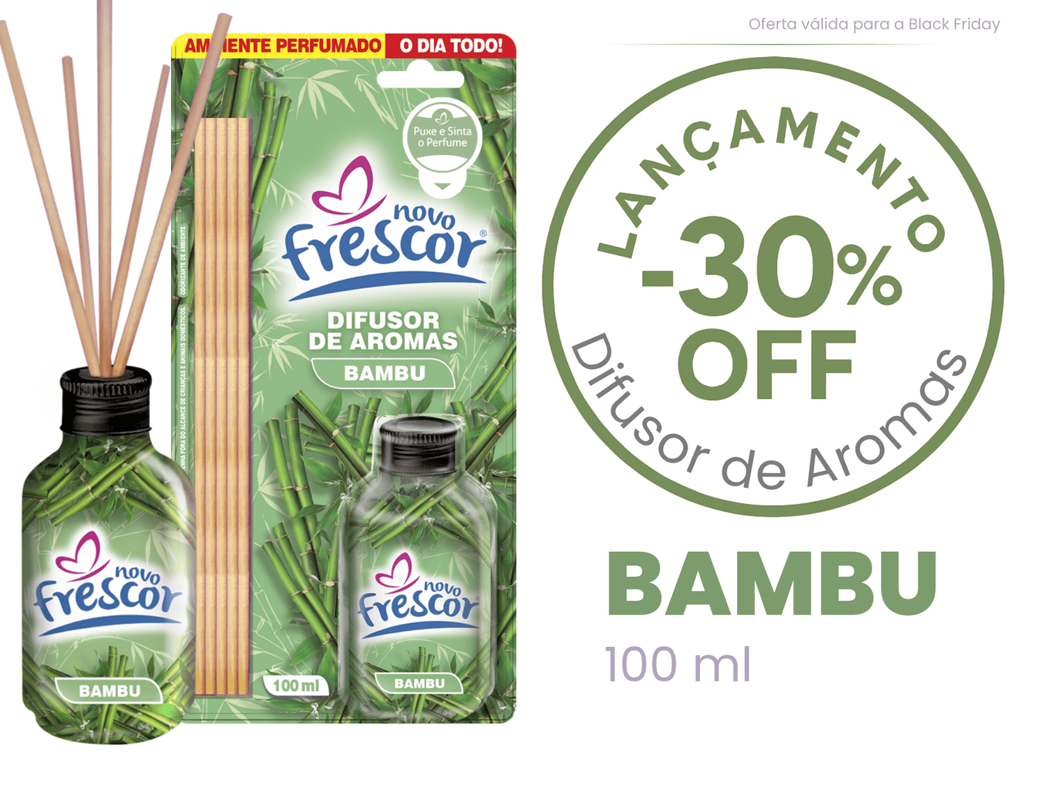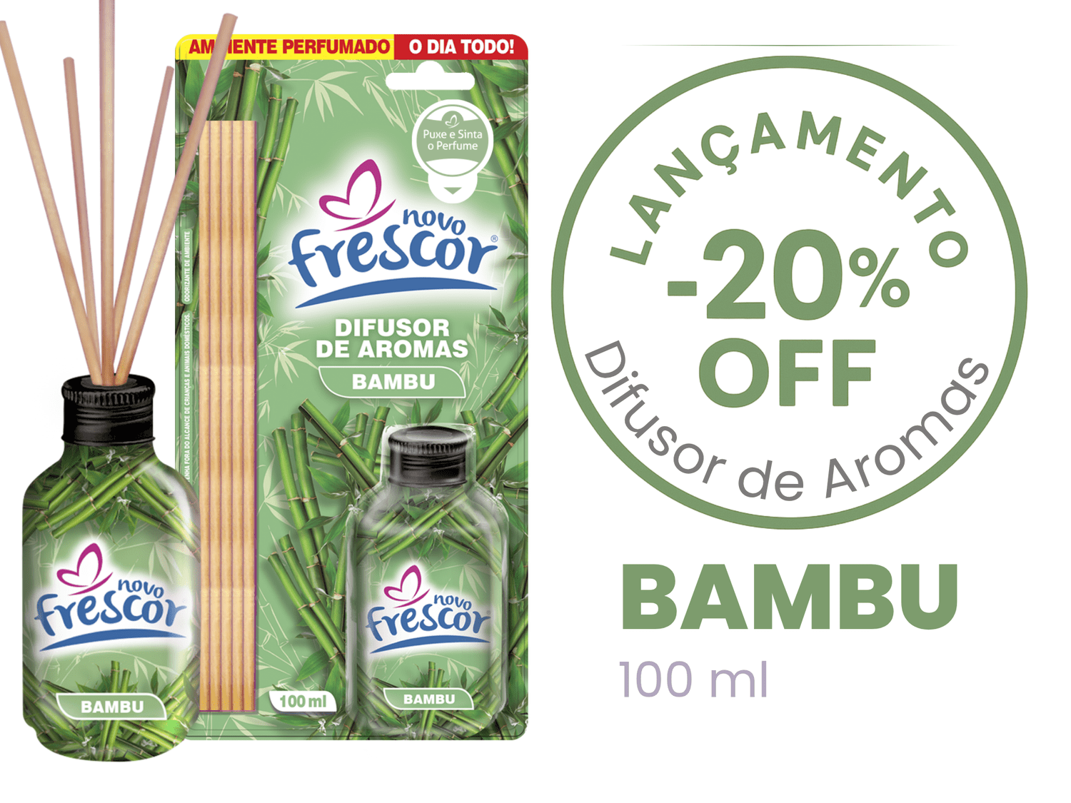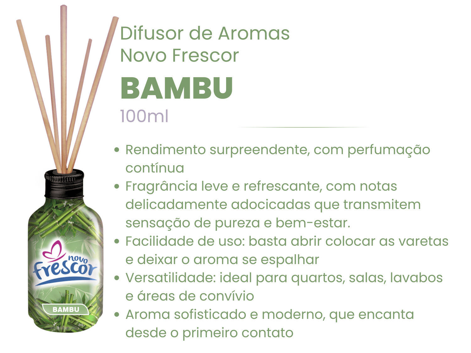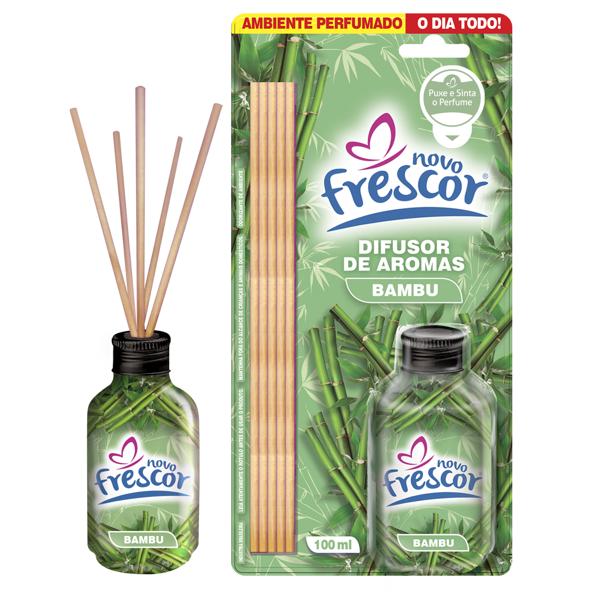 A linha de Difusores de Aromas Novo Frescor inclui também: Bambu, Capim Limão, Chá Branco, Cheirinho de Bebê, Cereja & Avelã, Cravo & Canela, Floral, Lavanda, Frutas Vermelhas, Laranja e Marine.