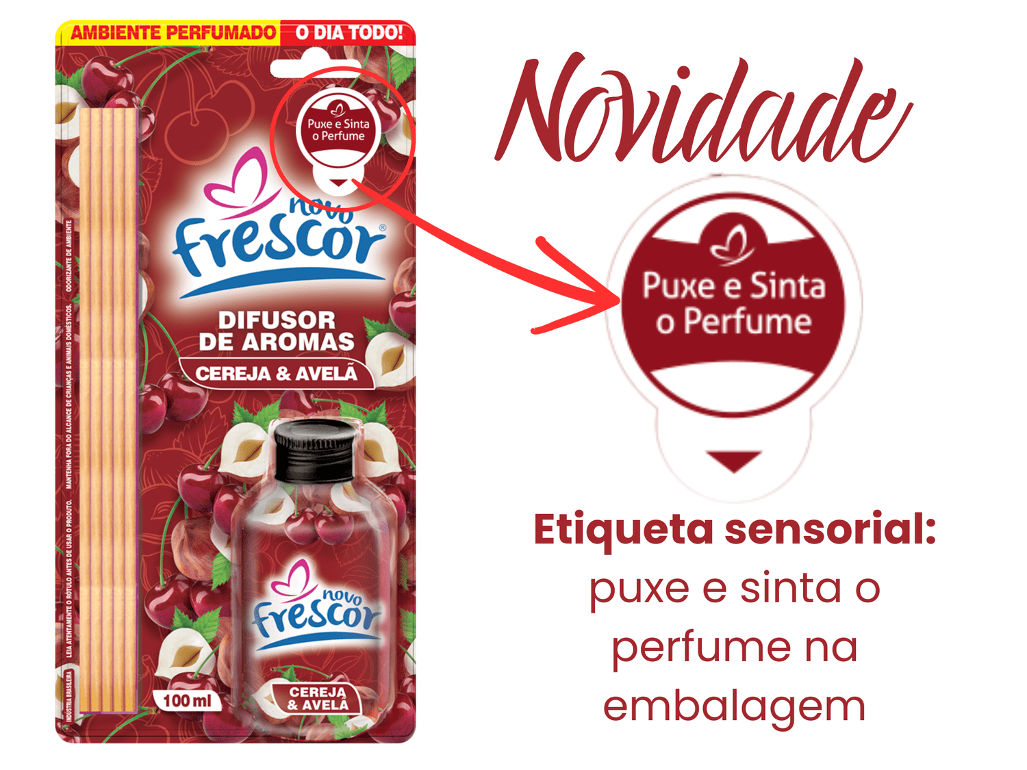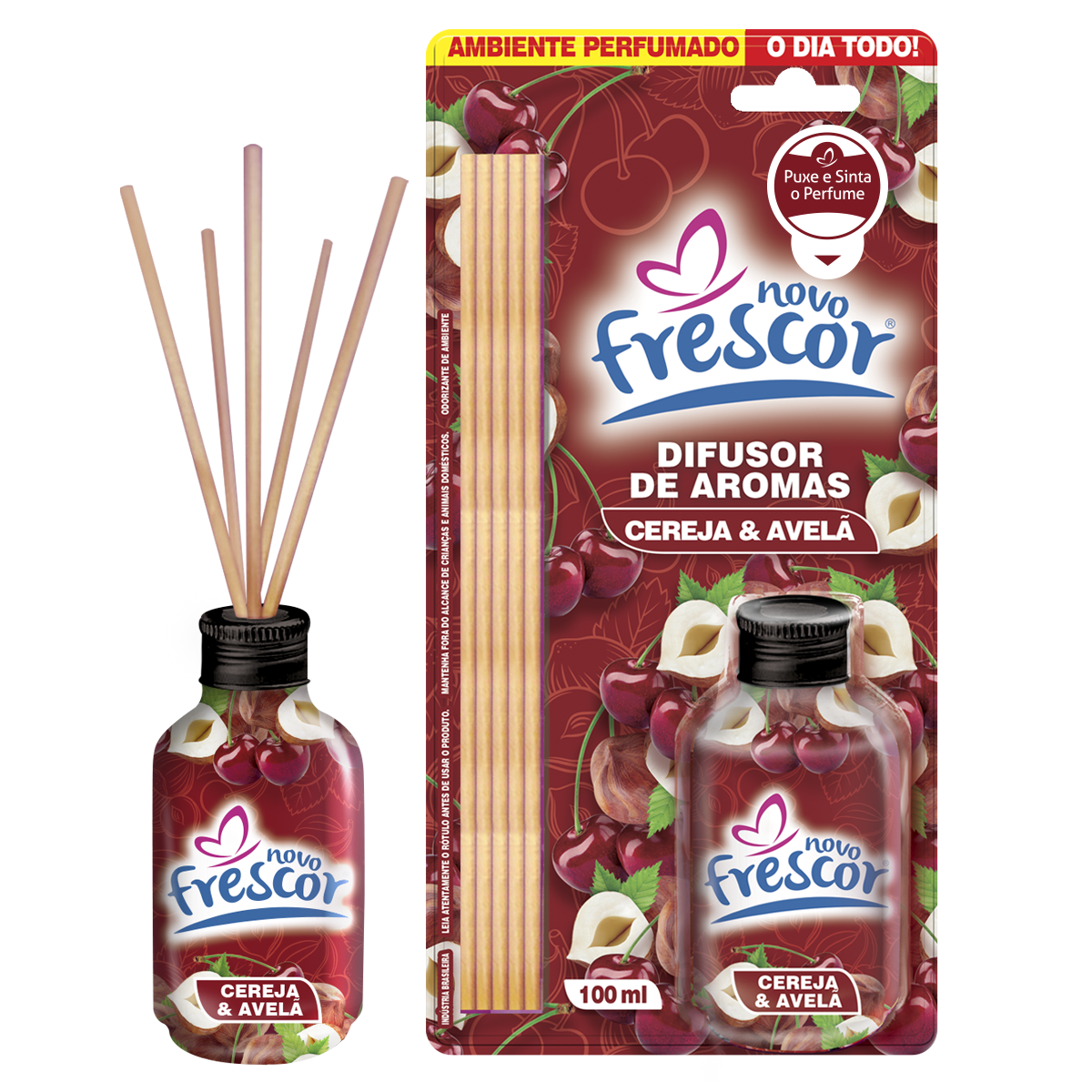 Além do Cereja & Avelã, a linha de Difusores de Aromas Novo Frescor conta com outras fragrâncias queridinhas: Capim Limão, Cravo & Canela, Chá Branco, Floral, Lavanda, Laranja, Frutas Vermelhas e Marine.