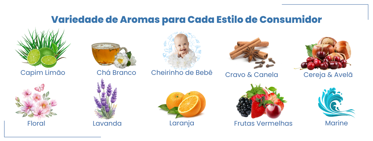 Com notas adocicadas e suaves, o Cheirinho de Bebê é reconhecido por seu apelo sensorial clássico e pela ampla aceitação entre consumidores que valorizam ambientes perfumados e aconchegantes.