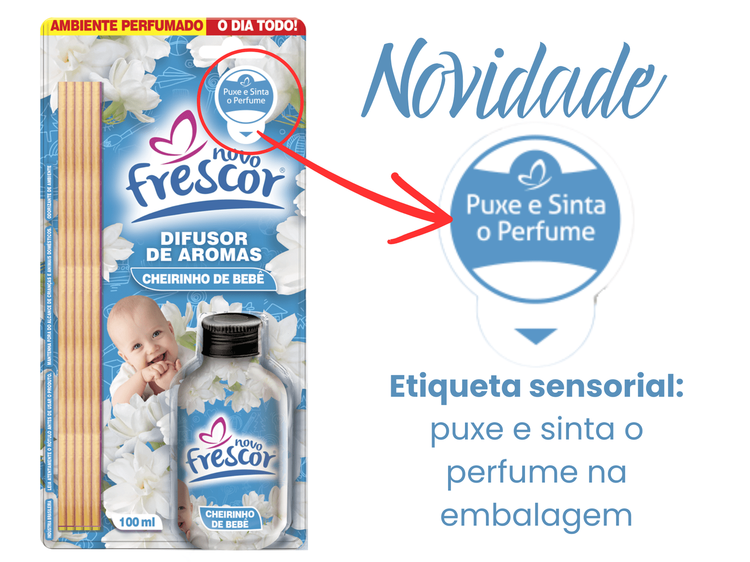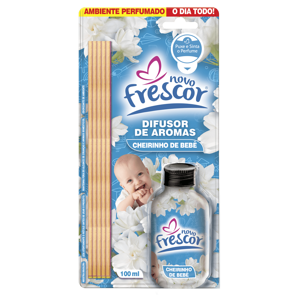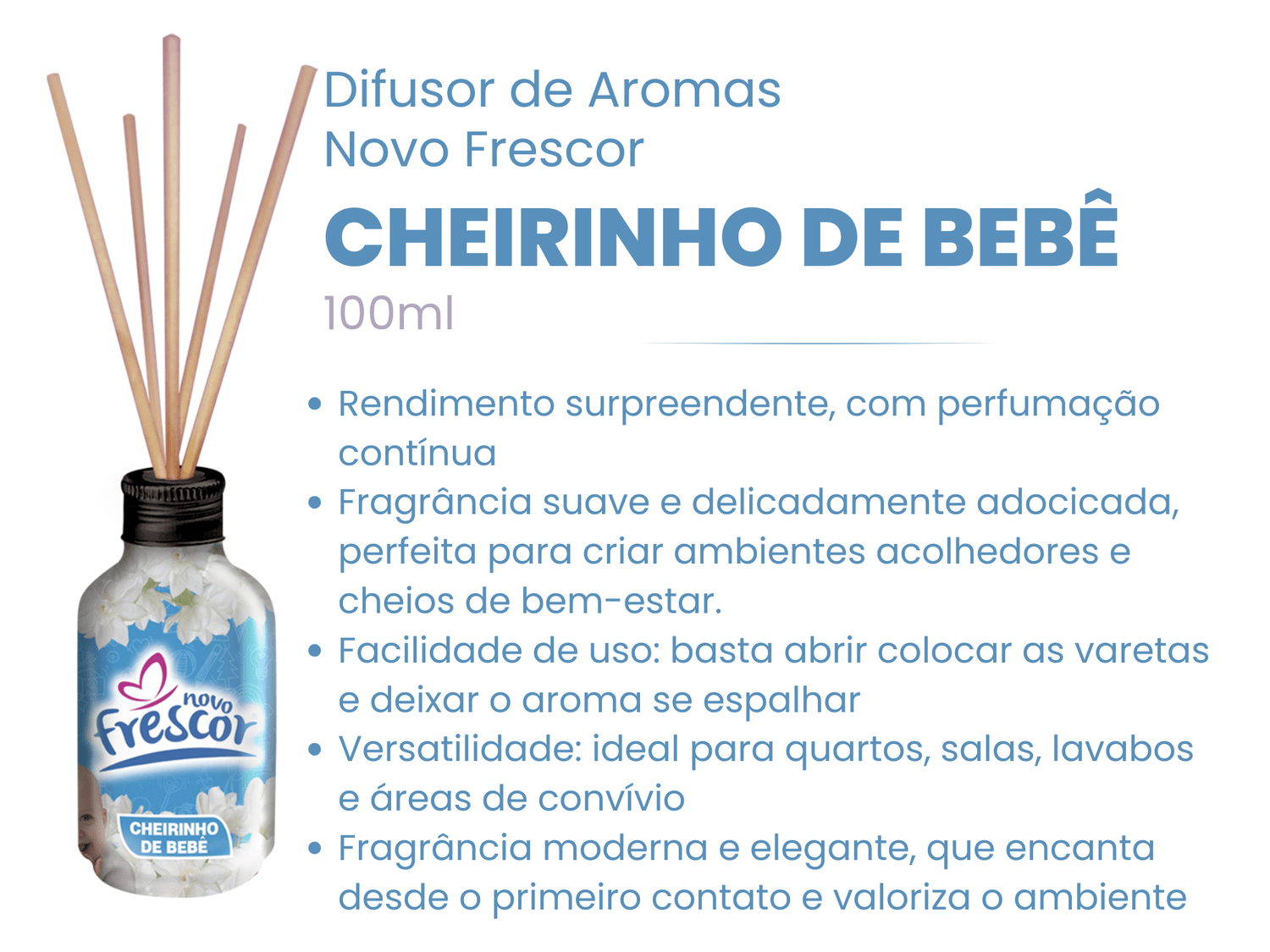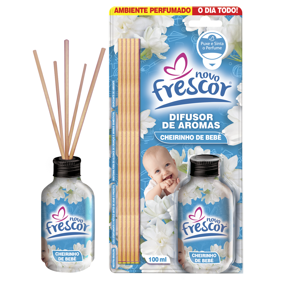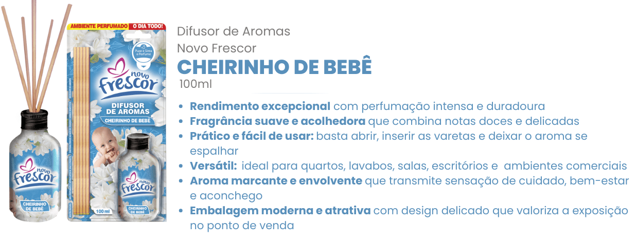 Além do Cheirinho de Bebê, a linha de Difusores de Aromas Novo Frescor conta com outras fragrâncias queridinhas: Capim Limão, Chá Branco, Cravo & Canela, Cereja & Avelã, Floral, Laranja, Frutas Vermelhas, Marine e Lavanda.