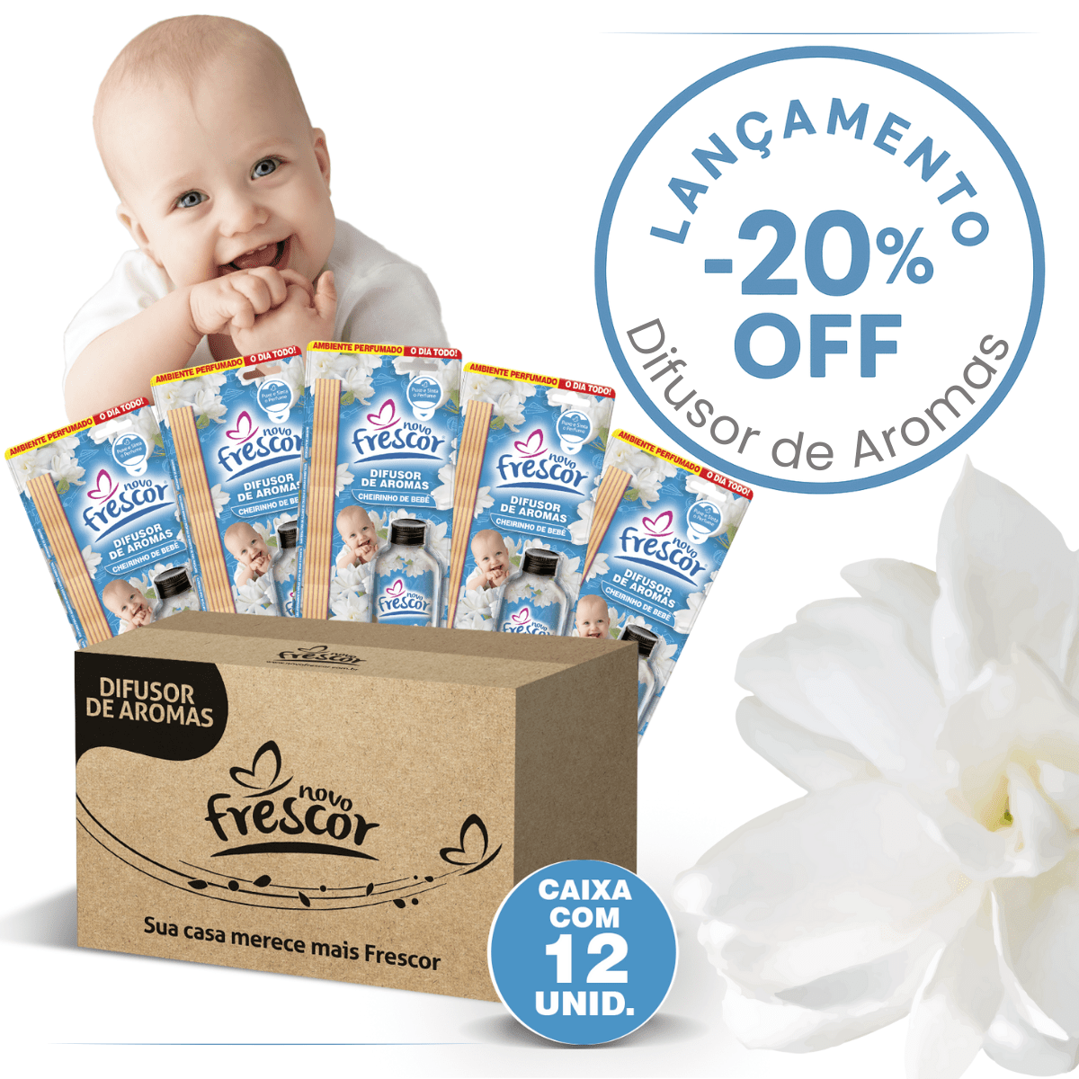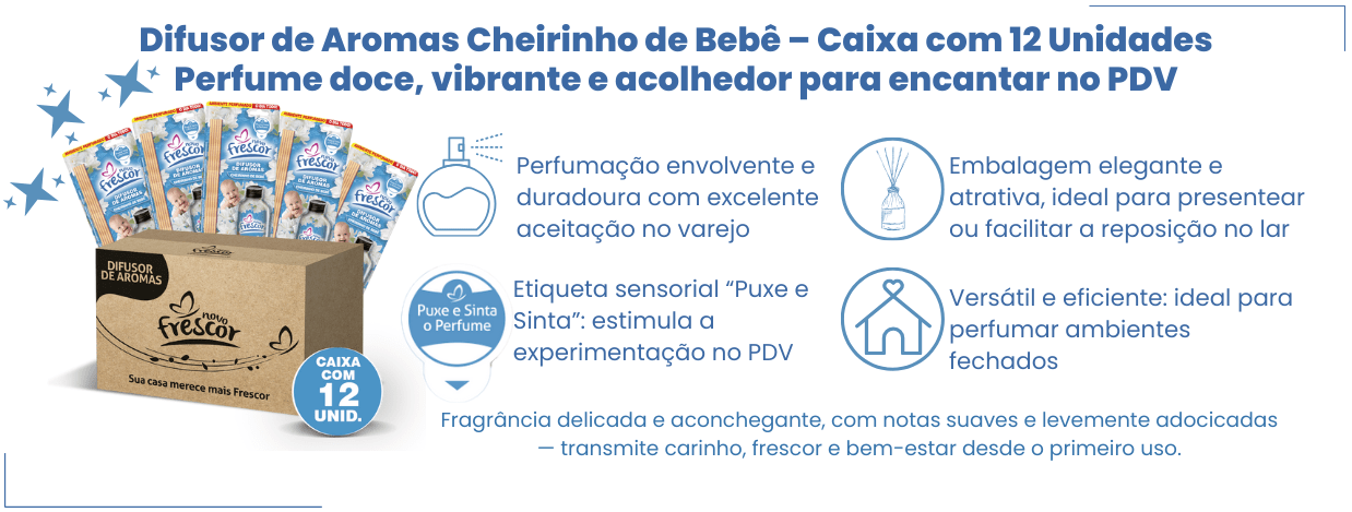 Ideal para revendedores e lojistas, a Caixa com 12 Unidades do Difusor de Aromas Cheirinho de Bebê Novo Frescor garante aconchego, excelente custo-benefício e alta rotatividade no ponto de venda.