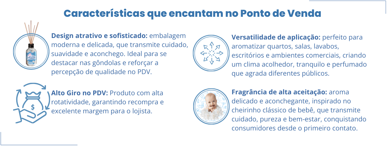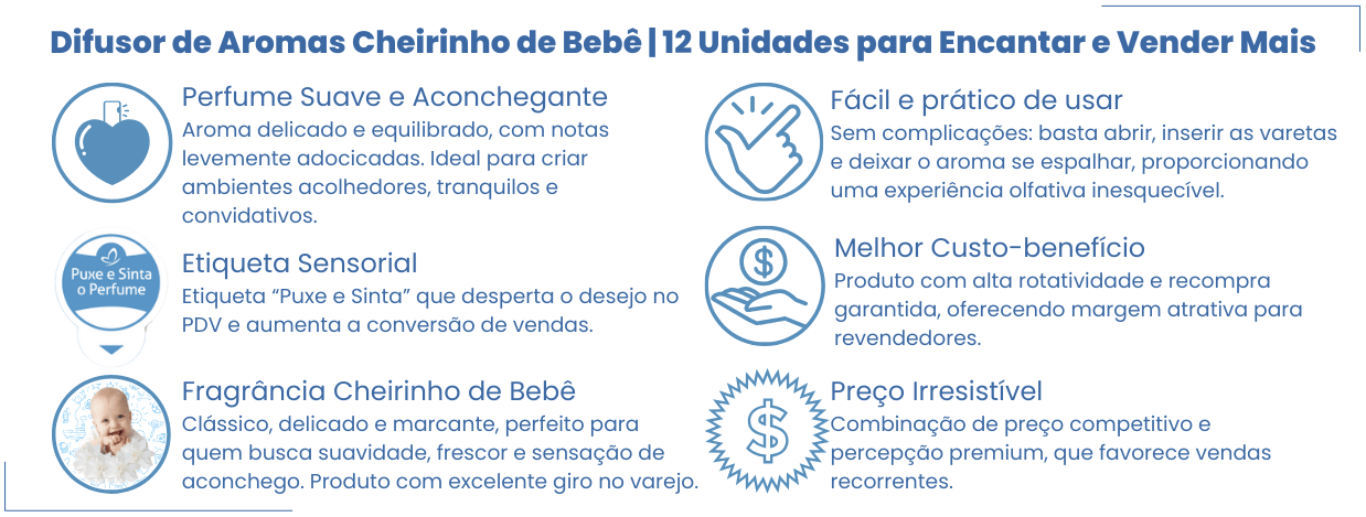 O Difusor Cheirinho de Bebê Novo Frescor é ideal para lojistas e distribuidores que buscam um produto com alto giro em prateleira e excelente aceitação entre os consumidores. Sua fragrância delicada combina aconchego e frescor, criando ambientes acolhedores e perfumados.