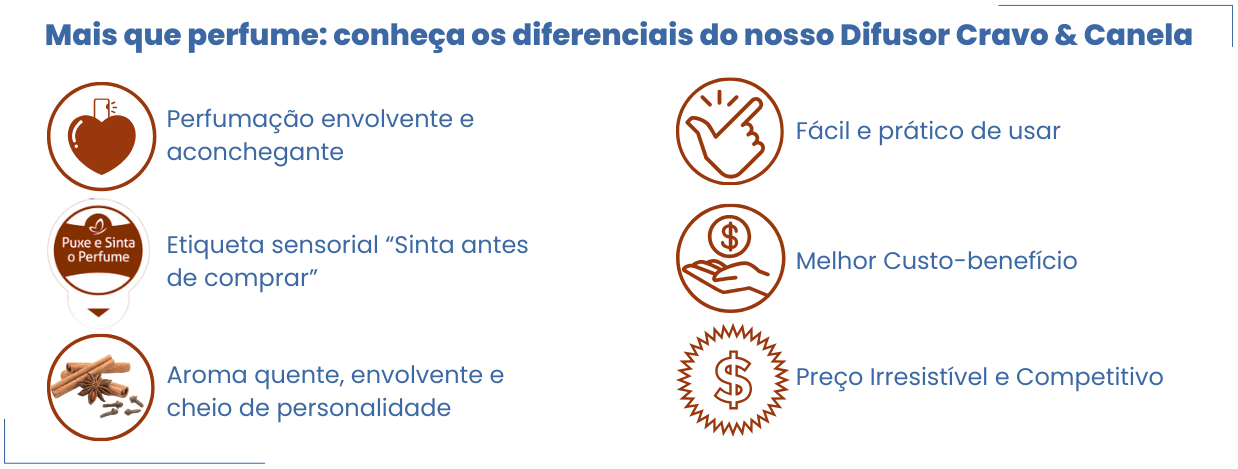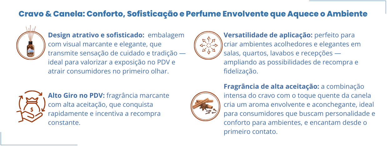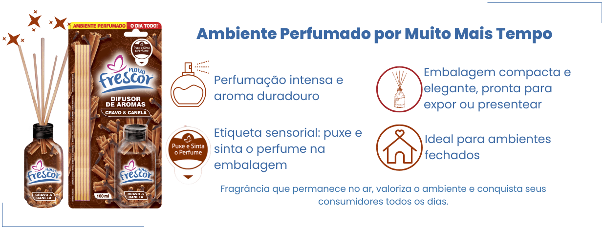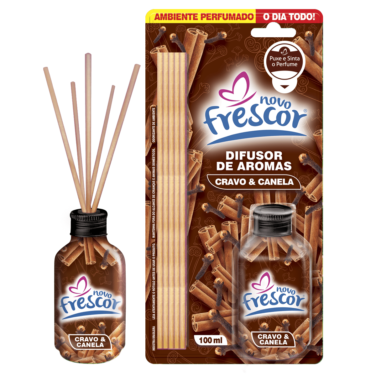 Com notas quentes e envolventes, o Difusor de Aromas Cravo & Canela Novo Frescor oferece perfume intenso e constante, ideal para quem busca criar ambientes aconchegantes, elegantes e com personalidade. Sua embalagem moderna valoriza a exposição no ponto de venda, encantando desde o primeiro contato.