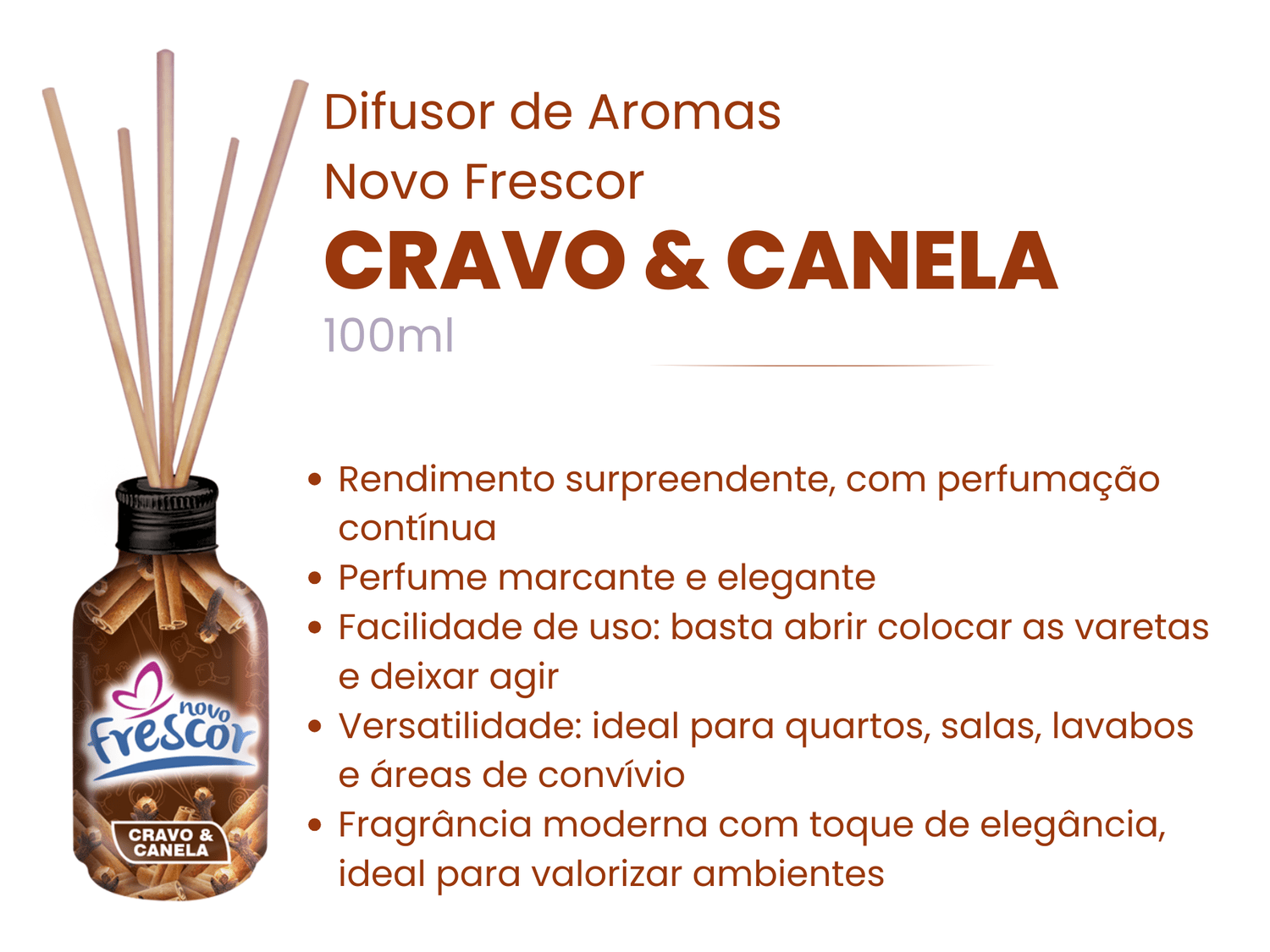 O Difusor de Aromas Cravo & Canela da Novo Frescor entrega um perfume intenso, acolhedor e marcante, ideal para quem busca transformar o ambiente com um toque de conforto e energia. A união das notas picantes do cravo com a doçura quente da canela cria uma experiência olfativa inconfundível.