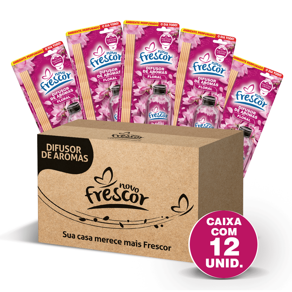 Ideal para revendedores e lojistas, a Caixa com 12 Unidades do Difusor de Aromas Floral Novo Frescor oferece elegância, excelente custo-benefício e alta rotatividade no ponto de venda.