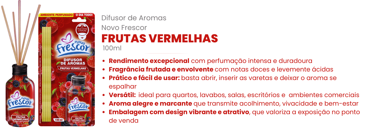 O Difusor de Aromas Frutas Vermelhas da Novo Frescor entrega uma fragrância doce e vibrante, com notas marcantes de frutas vermelhas que despertam os sentidos e criam uma atmosfera acolhedora, alegre e sofisticada. Seu aroma conquista de imediato, sendo ideal para quem busca energia, charme e bem-estar no dia a dia.