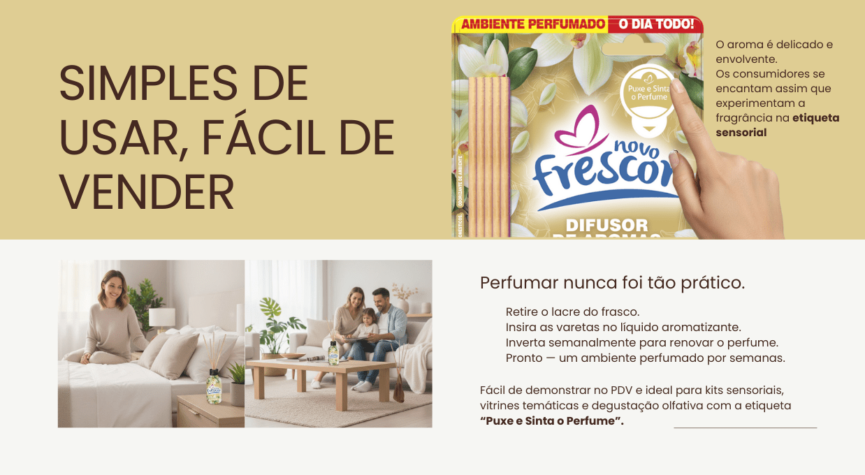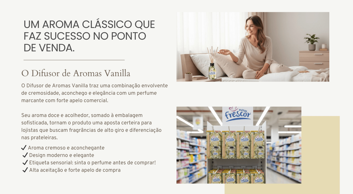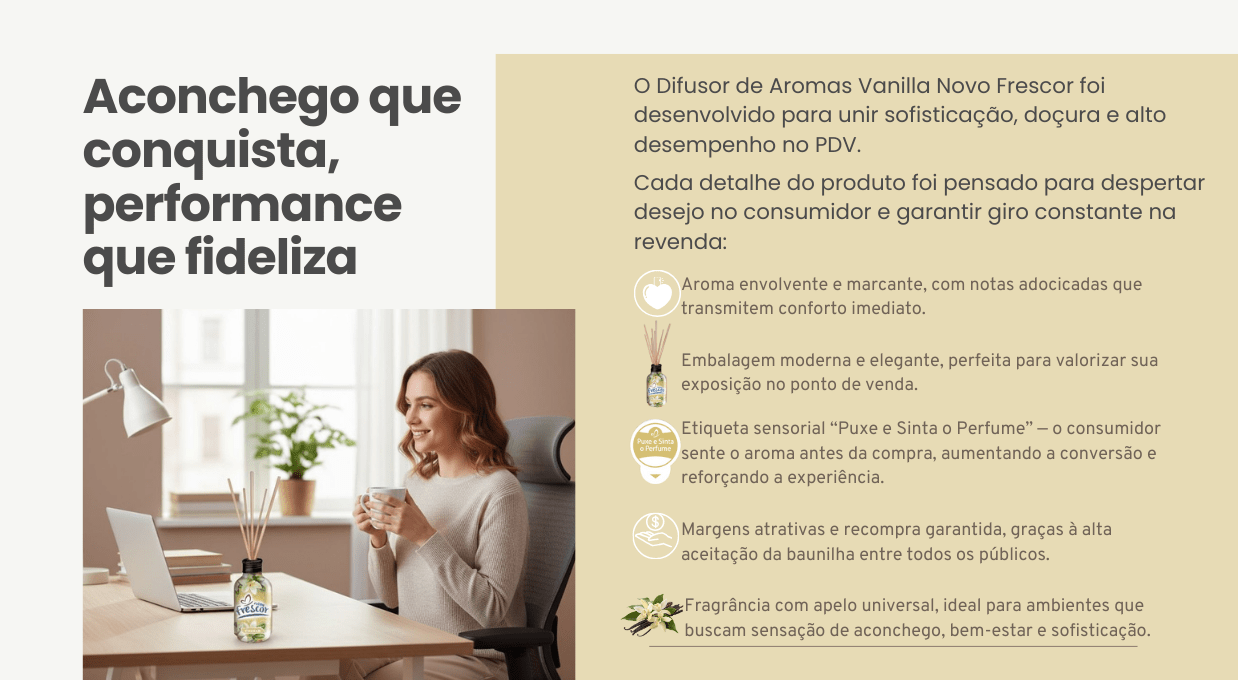 O Difusor de Aromas Vanilla é um dos destaques da linha Novo Frescor. Com posicionamento premium acessível, torna-se uma peça central no PDV, chamando atenção pela cor, apresentação sofisticada e aroma de alta aceitação.