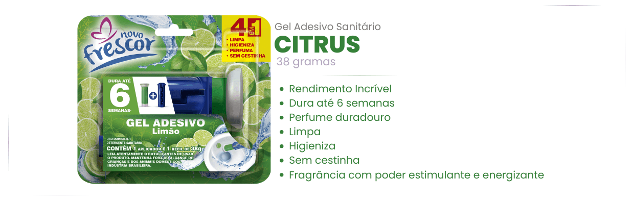 O gel adesivo sanitário Novo Frescor Citrus é uma opção incrível para quem busca um vaso sanitário perfumado, higienizado e limpo. A fragrância citrus é caracterizada por sua natureza fresca, energética e radiante ao mesmo tempo, ela age no ambiente trazendo uma sensação de limpeza e pureza.