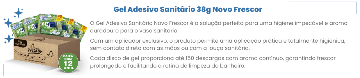 O Gel Adesivo Sanitário Novo Frescor também traz um aroma irresistível. E, essa linha foi cuidadosamente pensada para que nossos clientes tenham uma experiência inovadora sem precisar investir altos valores, e ainda entregar aos seus consumidores uma solução econômica e com alta eficiência, que proporcionará uma experiência sensorial encantadora.