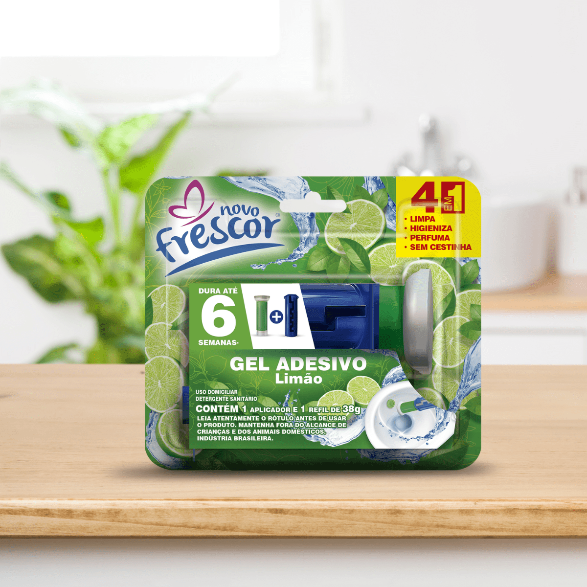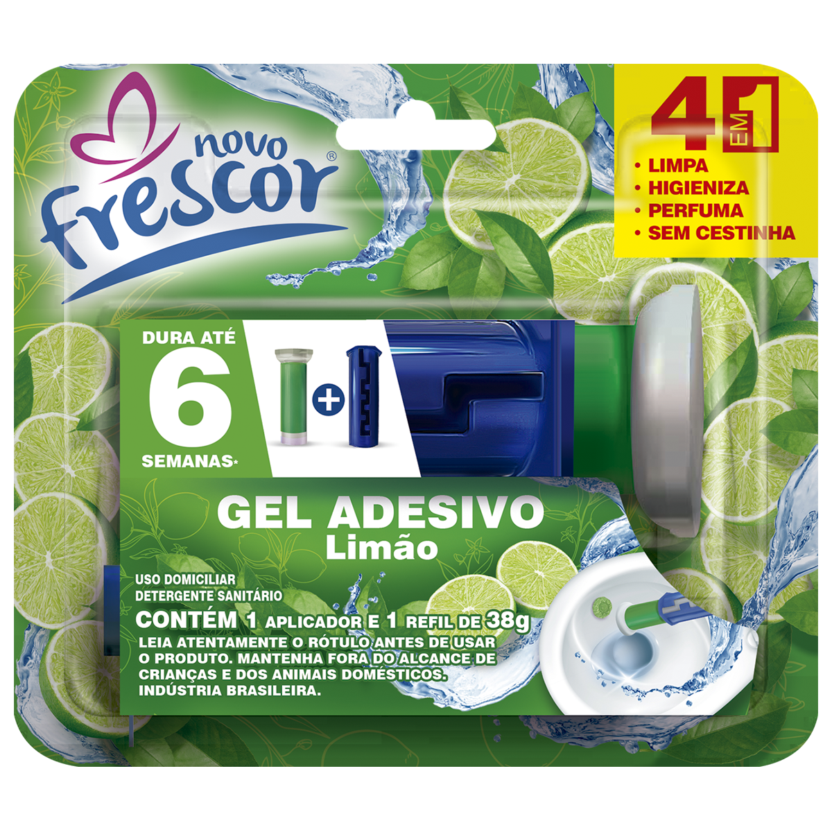 O Gel Adesivo Sanitário da Novo Frescor foi formulado com uma tecnologia, para que cada descarga seja uma experiência revigorante, deixando o vaso sanitário limpo, perfumado e com aquele frescor surpreendente. Além disso, ele é econômico e eficiente. Cada embalagem contém um aplicador com 6 aplicações de pura ação de limpeza, onde cada disco aplicado tem duração de até 150 descargas.