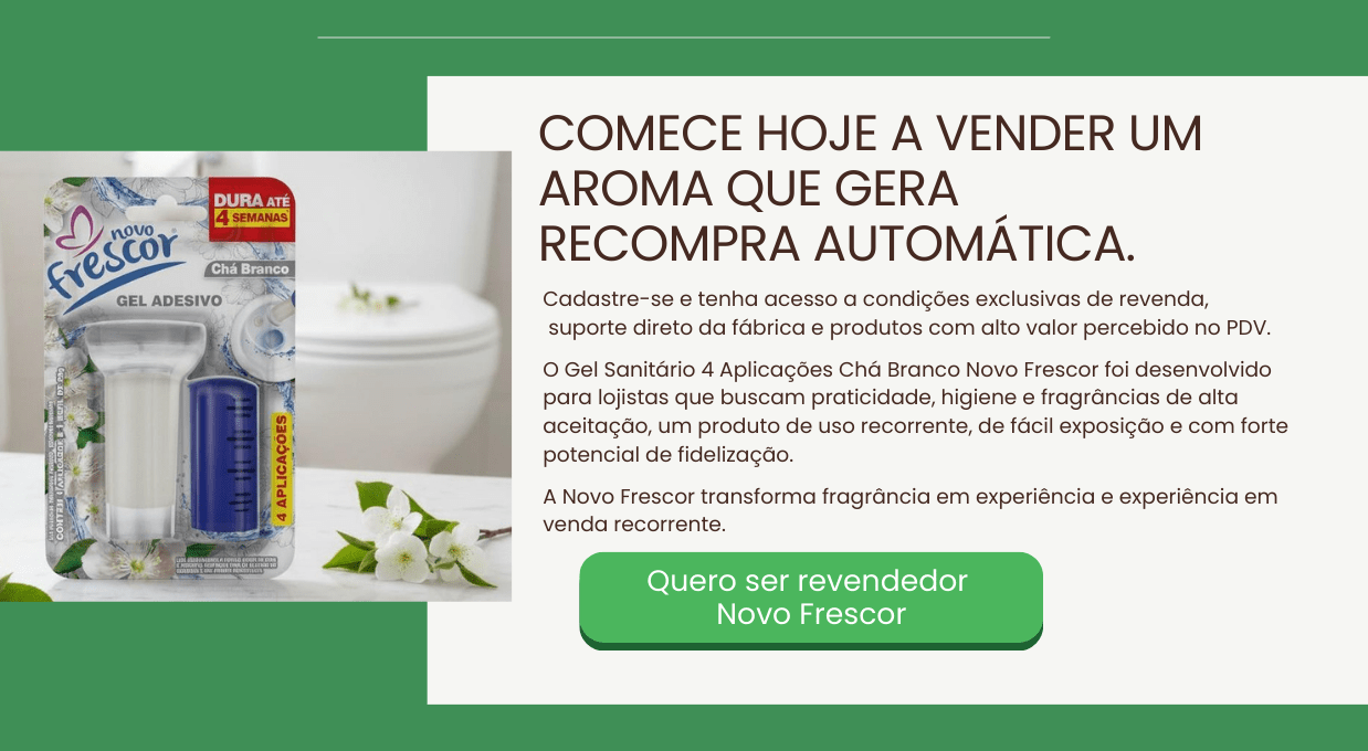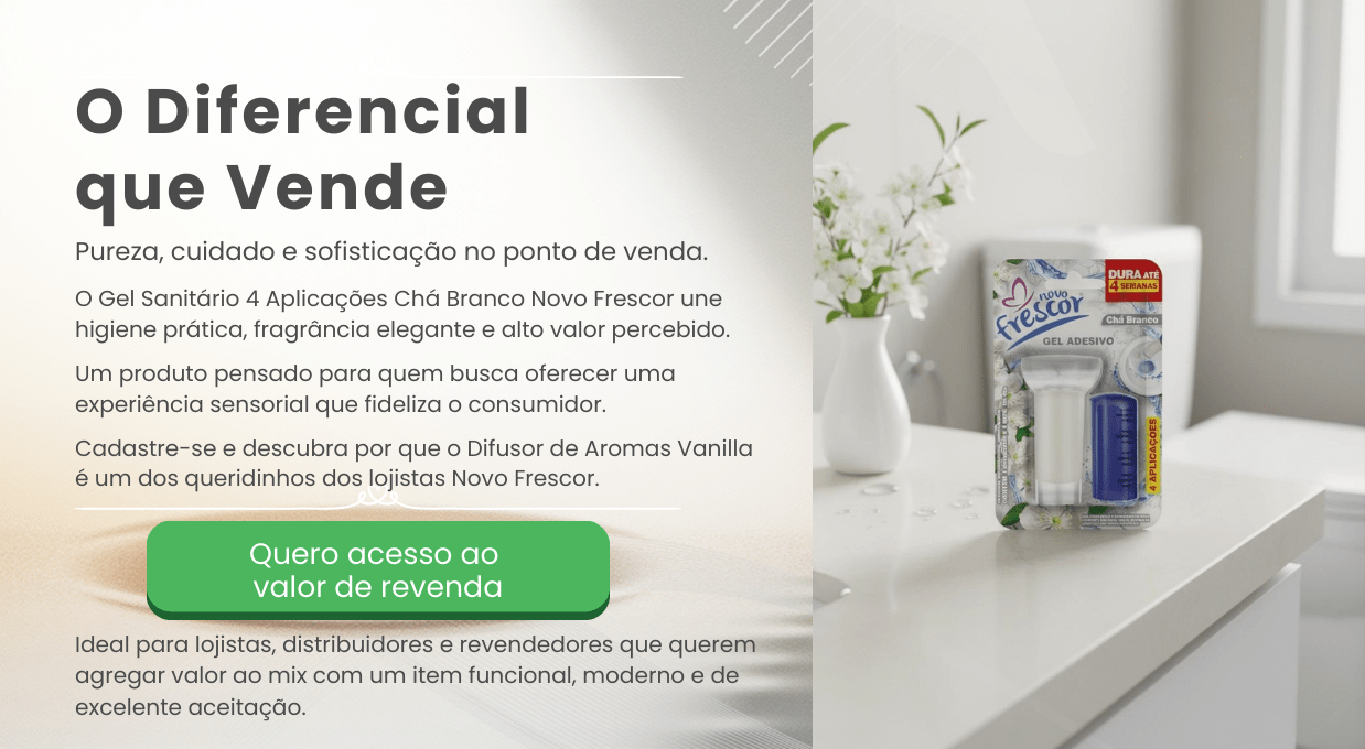 O Gel Adesivo Sanitário Novo Frescor – Chá Branco é uma excelente opção para lojistas e distribuidores que buscam um produto de alta saída e apelo visual no ponto de venda. Com 4 aplicações por embalagem, com aplicador, fragrância suave e delicada de alta aceitação, entrega desempenho e ótimo custo-benefício. Seu formato compacto facilita a exposição nas gôndolas, incentivando a recompra e atraindo consumidores que valorizam praticidade e bem-estar no dia a dia.