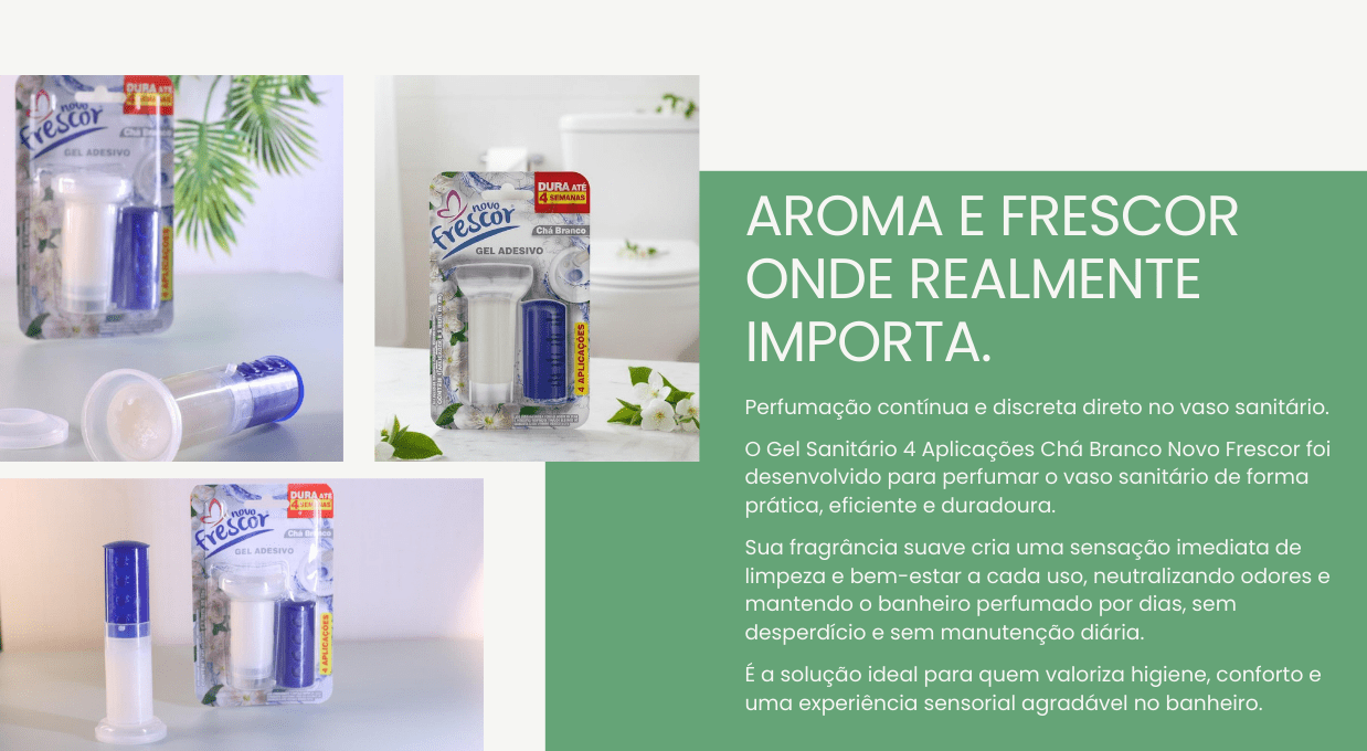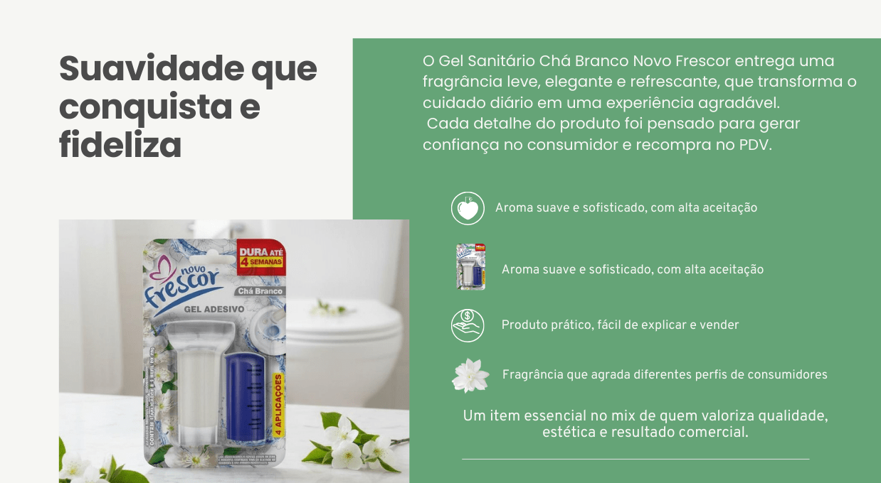 O Gel Sanitário 4 Aplicações Chá Branco Novo Frescor foi desenvolvido para atender uma demanda clara do varejo: fragrância contínua no banheiro, aplicação simples e recompra frequente.