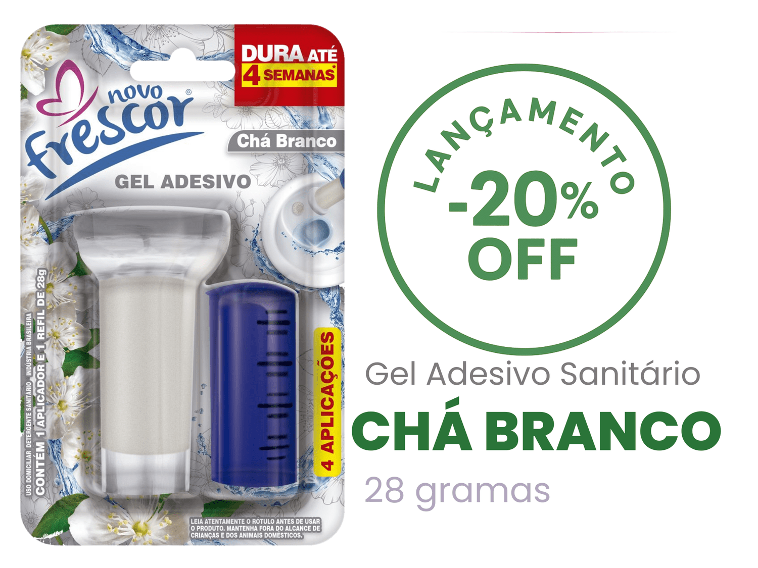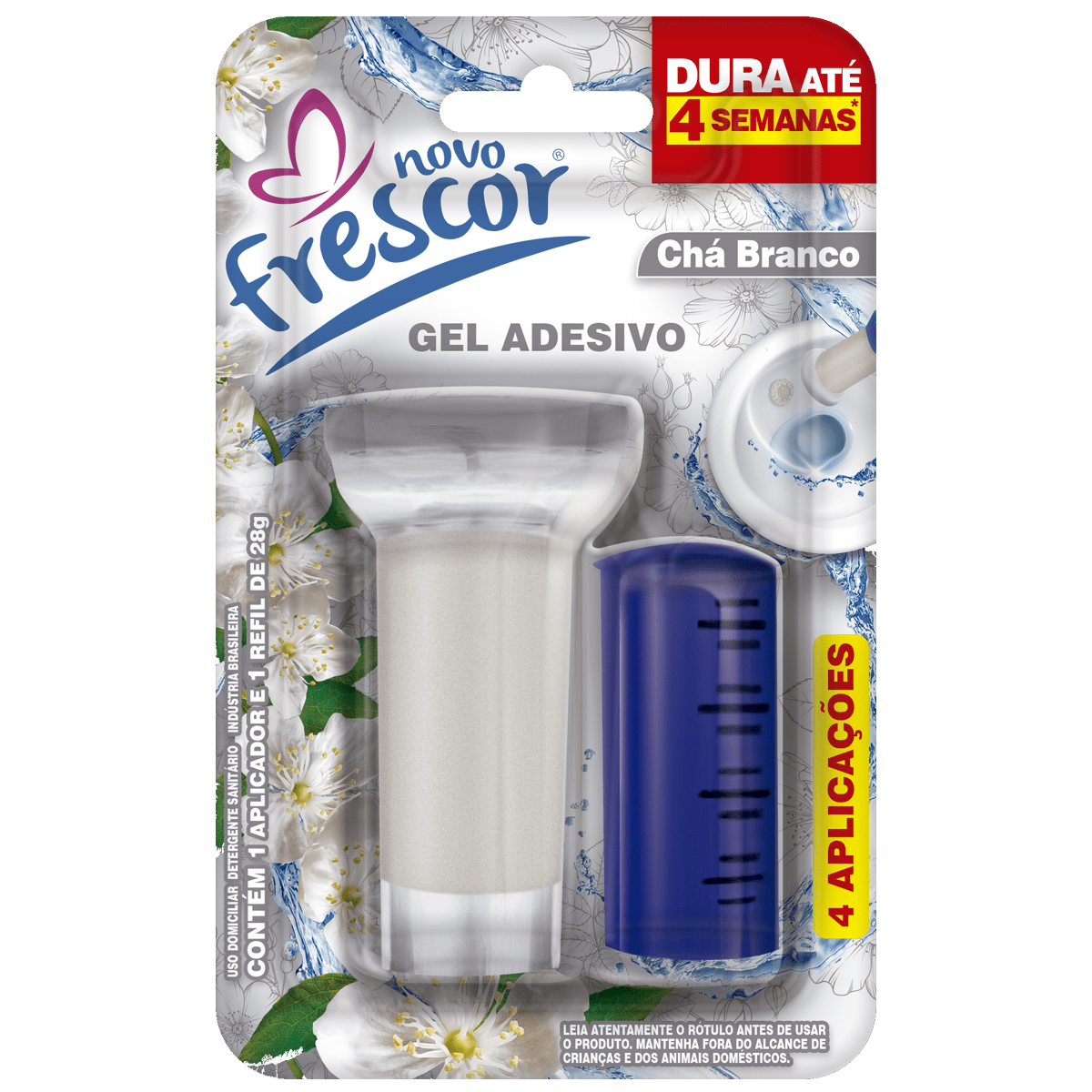 O Gel Sanitário 4 Aplicações Novo Frescor – Chá Branco oferece 4 aplicações por embalagem, garantindo até 4 semanas de perfumação contínua, com duração média de até 7 dias por aplicação, conforme o uso.