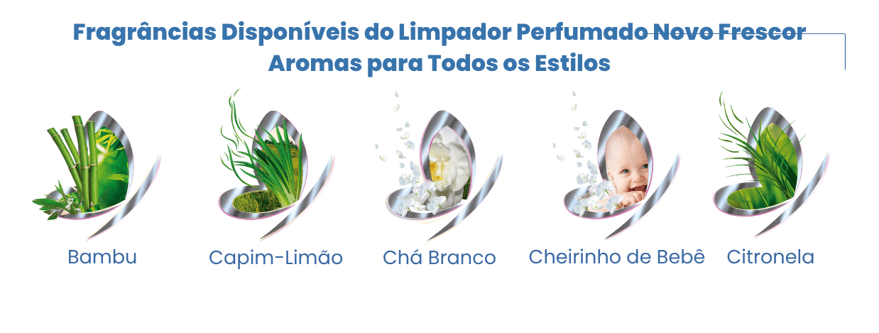 A Novo Frescor oferece uma linha completa de fragrâncias cuidadosamente desenvolvidas para transformar a limpeza em uma experiência sensorial única. São opções que agradam todos os gostos: desde aromas clássicos e delicados como Lavanda, Vanilla, Cheirinho de Bebê e Chá Branco, até fragrâncias marcantes e refrescantes como Capim-Limão, Citronela, Eucalipto e Laranja.