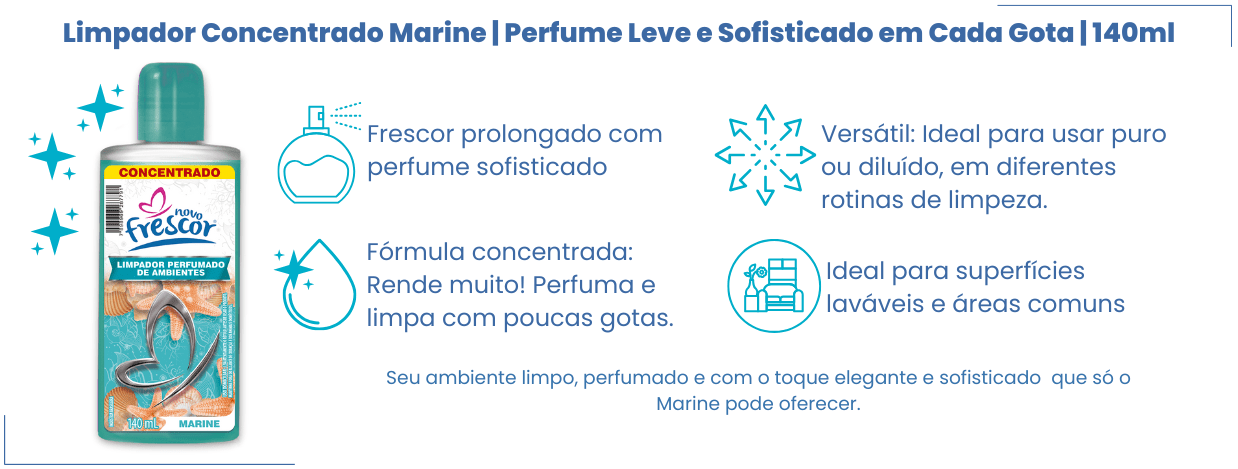 O Limpador Perfumado Concentrado Marine da Novo Frescor une eficiência na limpeza, perfume duradouro e apelo sensorial sofisticado. Com fórmula concentrada e embalagem compacta, é ideal para lojistas, atacadistas e distribuidores que buscam um item de excelente giro, margem atrativa e forte presença no PDV.