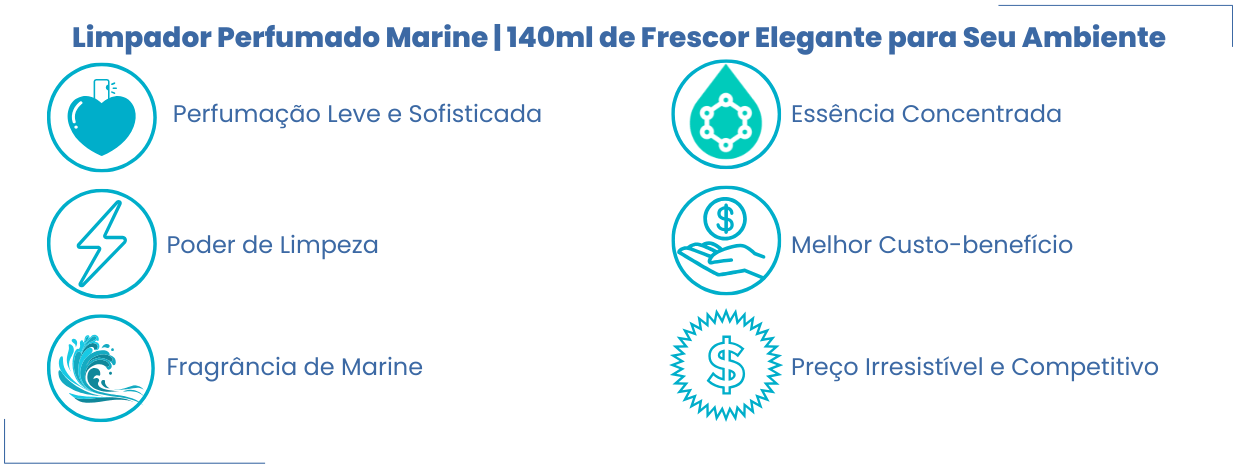 O Limpador Perfumado Concentrado Marine é ideal para quem busca aliar alto poder de limpeza com uma fragrância fresca, elegante e de longa duração.