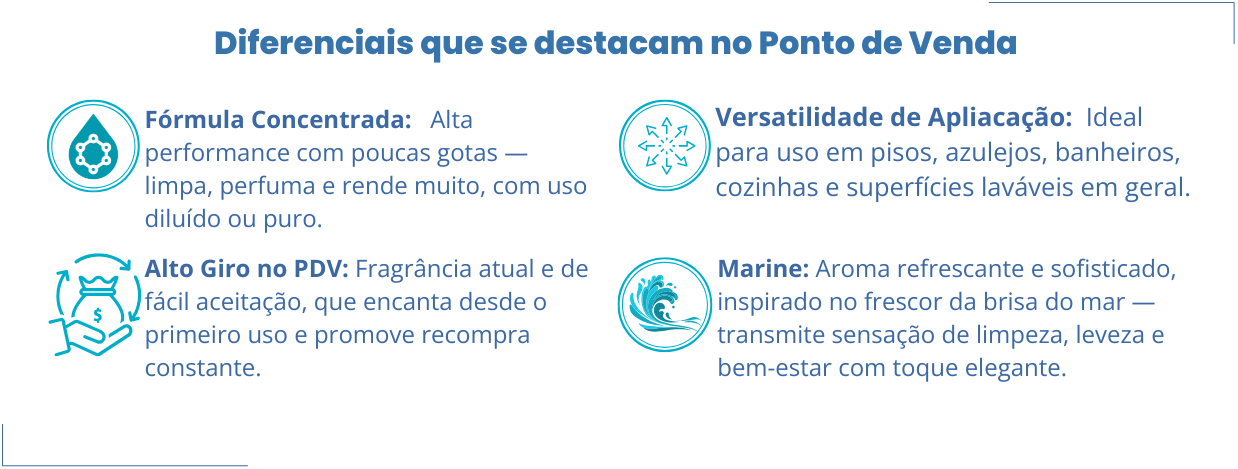 Sua fórmula concentrada garante excelente rendimento, economia por aplicação e praticidade no armazenamento. O aroma Marine transmite uma sensação de limpeza prolongada e bem-estar — tornando o produto uma escolha estratégica para revendedores, distribuidoras, supermercados, atacarejos e lojas especializadas em limpeza.