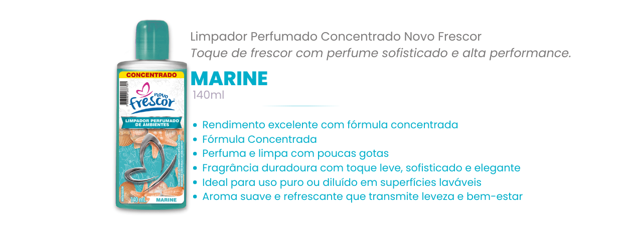 Com uma combinação ideal entre eficiência na limpeza, fragrância refrescante e excelente custo-benefício, o Limpador Perfumado Concentrado Marine entrega tudo o que o consumidor busca em um só produto.