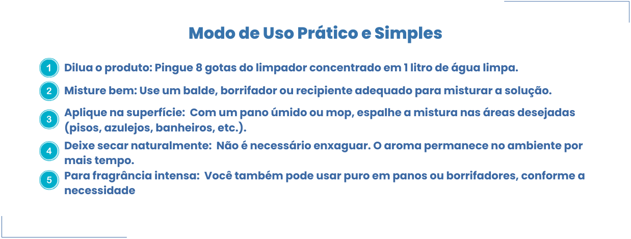 Com apenas algumas gotas, você garante uma limpeza eficiente, prática e perfumada. Pode ser usado puro ou diluído, em diversos tipos de superfícies. O aroma agradável permanece por mais tempo no ambiente, deixando aquela sensação de casa bem cuidada com leveza e elegância. Além da eficácia na higienização, seu aroma agradável permanece no ambiente, garantindo frescor por muito mais tempo.
