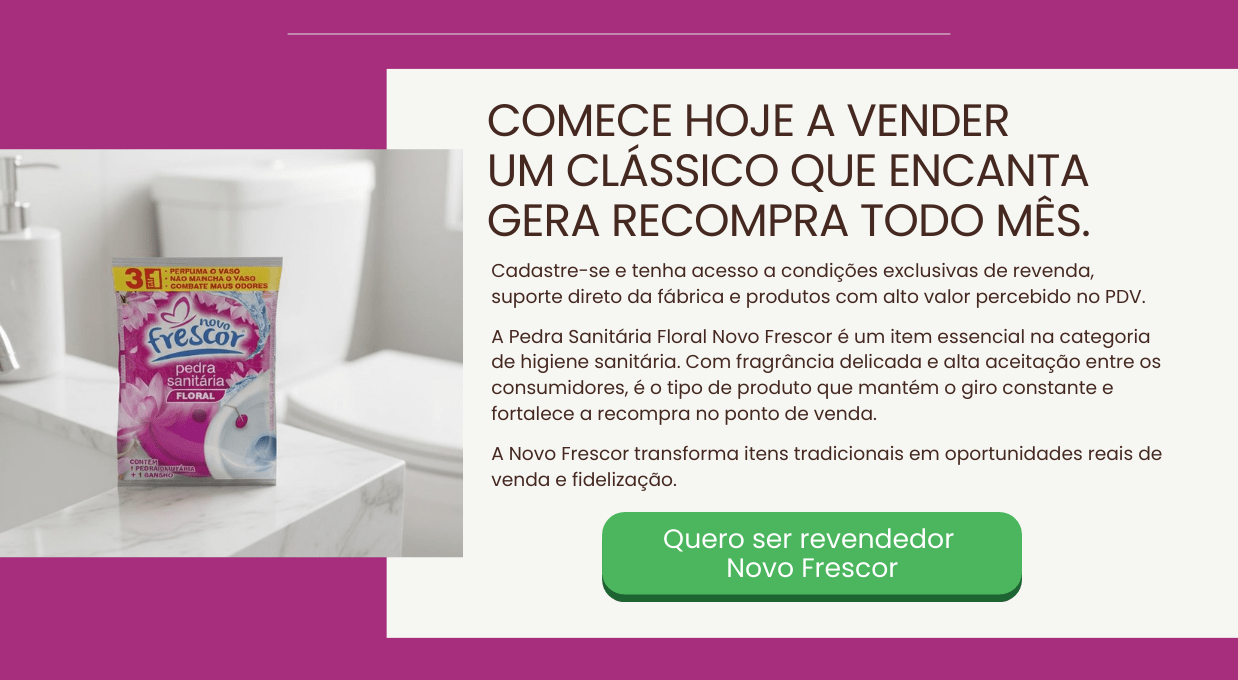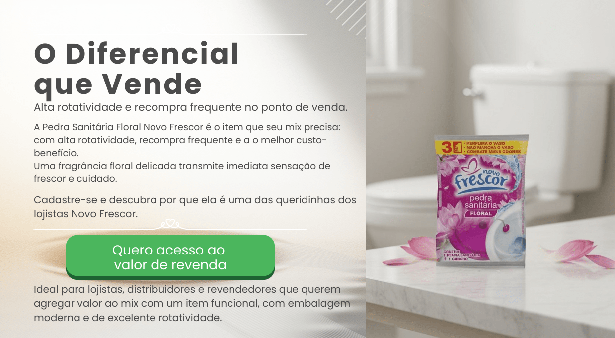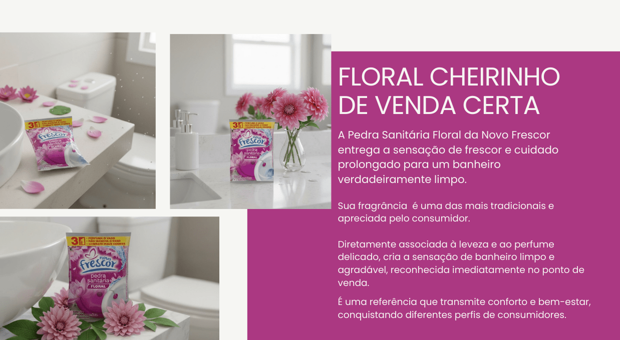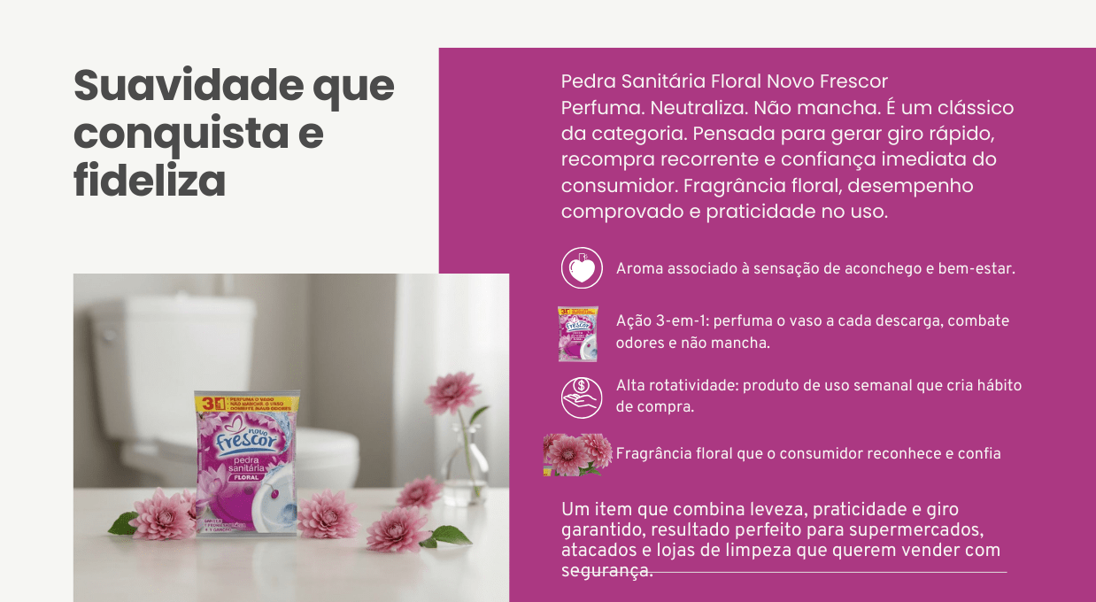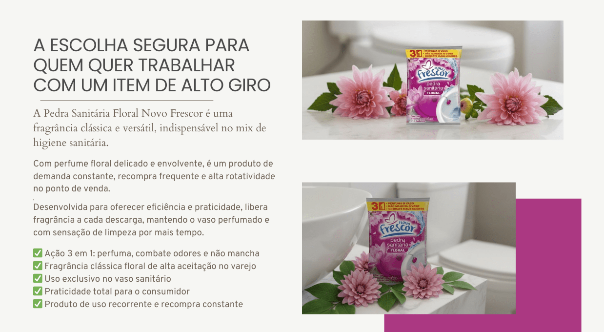 Integrando um mix estratégico de higiene sanitária, a Pedra Sanitária Floral se posiciona como um dos destaques da linha Novo Frescor. A marca já é reconhecida por qualidade, performance e excelente custo-benefício, fortalecendo a presença no PDV e ampliando as oportunidades de vendas cruzadas na categoria.