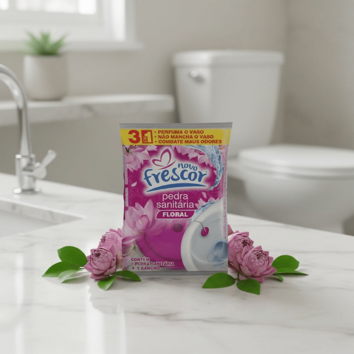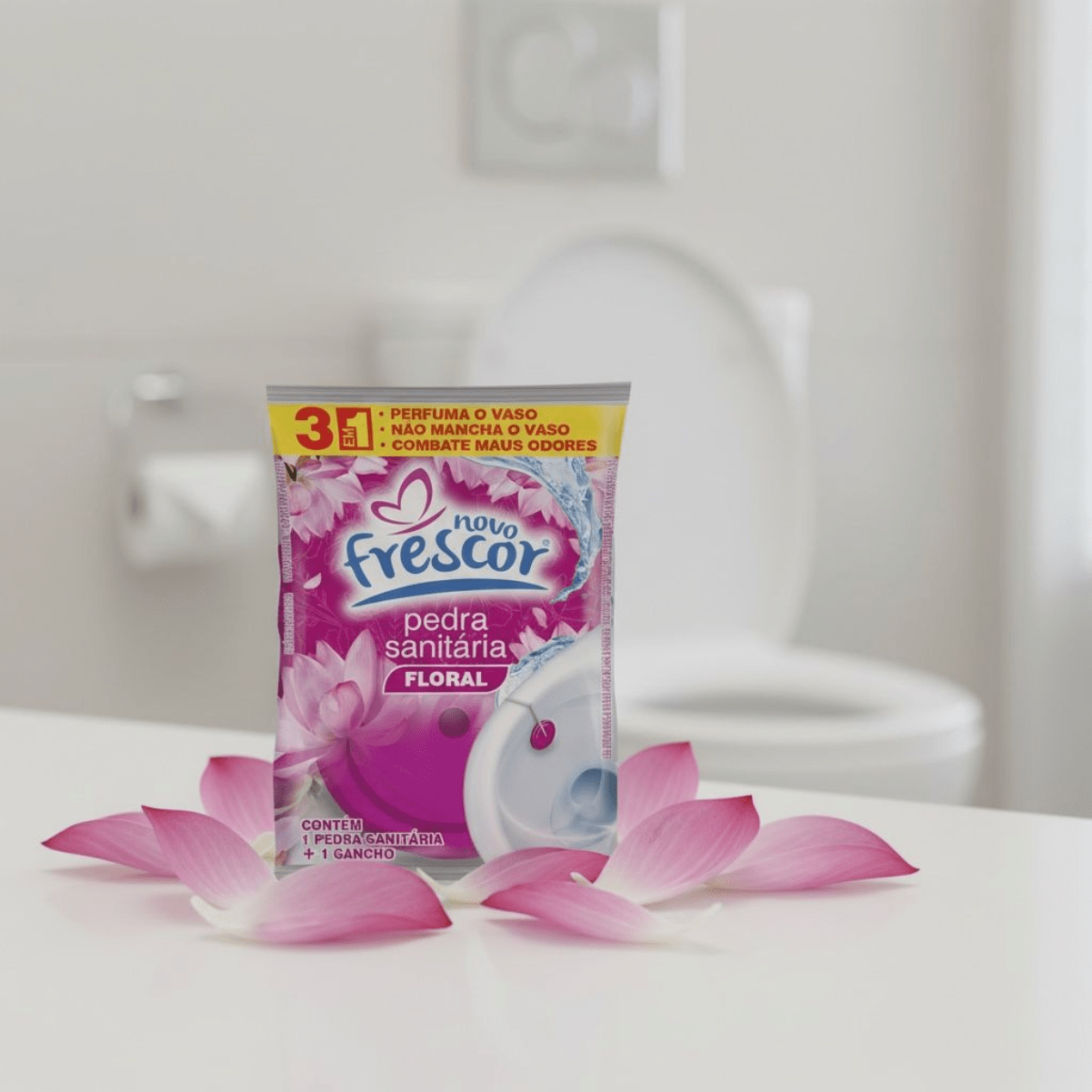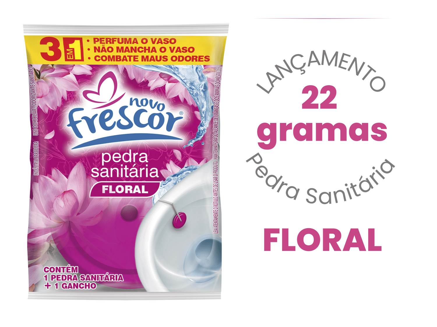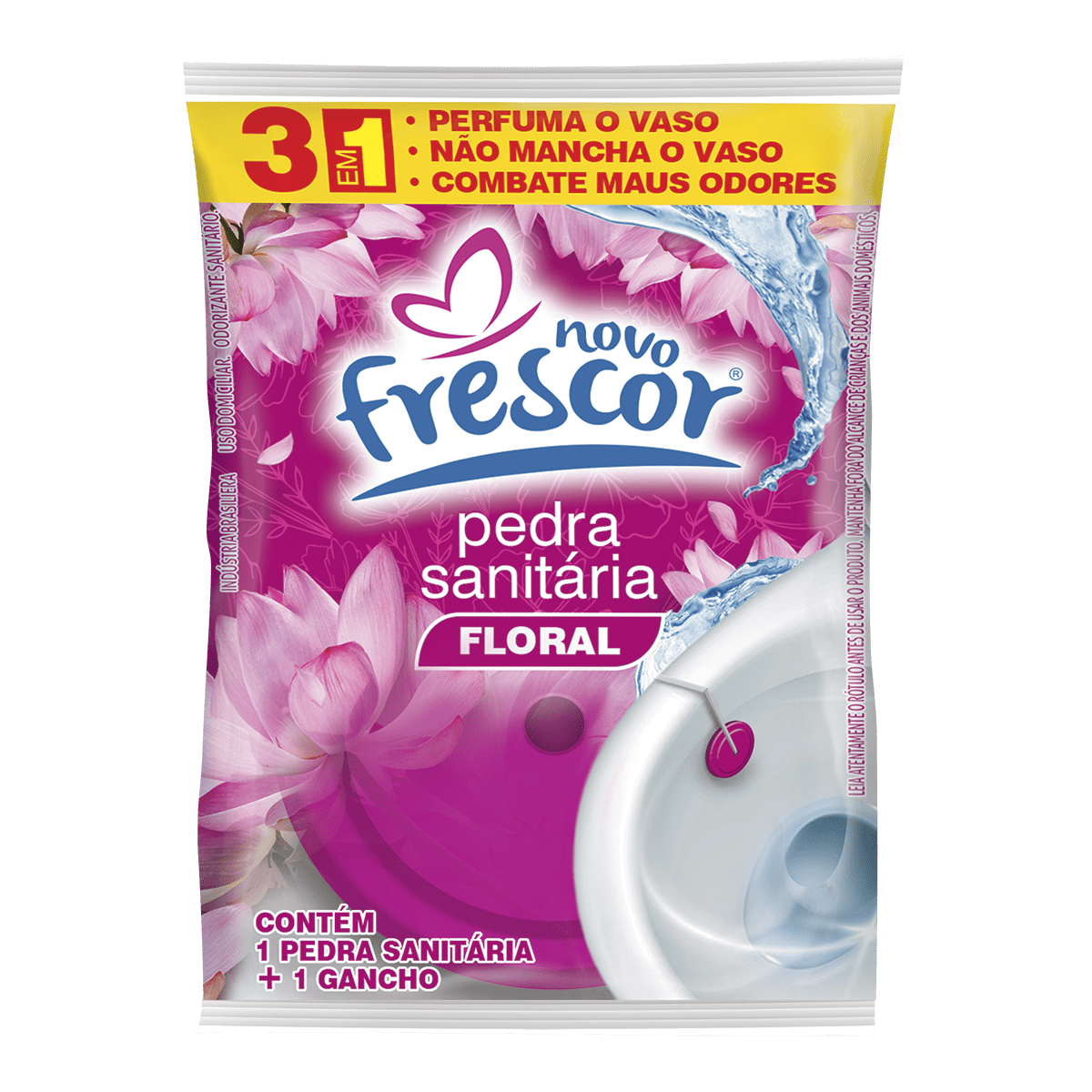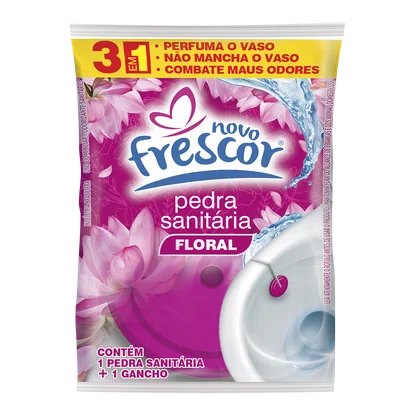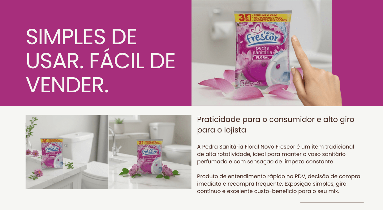 A Pedra Sanitária Floral Novo Frescor é um item tradicional, de altíssima rotatividade e indispensável no mix de higiene sanitária. Com ação 3 em 1 que perfuma o vaso, não mancha e combate os maus odores, entrega a clássica sensação de limpeza que o consumidor já conhece, confia e procura no ponto de venda. É um produto de recompra frequente, fácil de expor, com excelente giro e grande aceitação por parte dos consumidores.