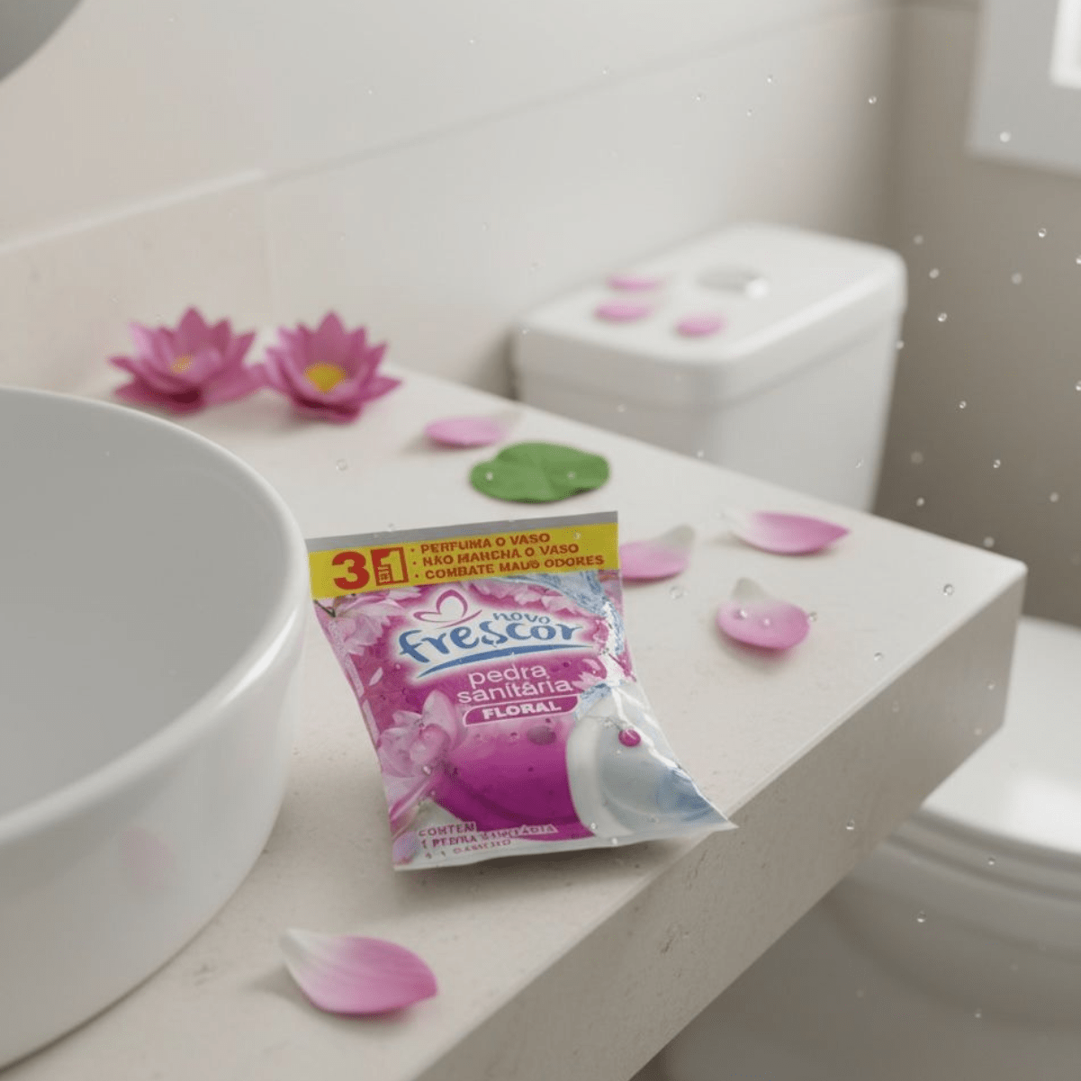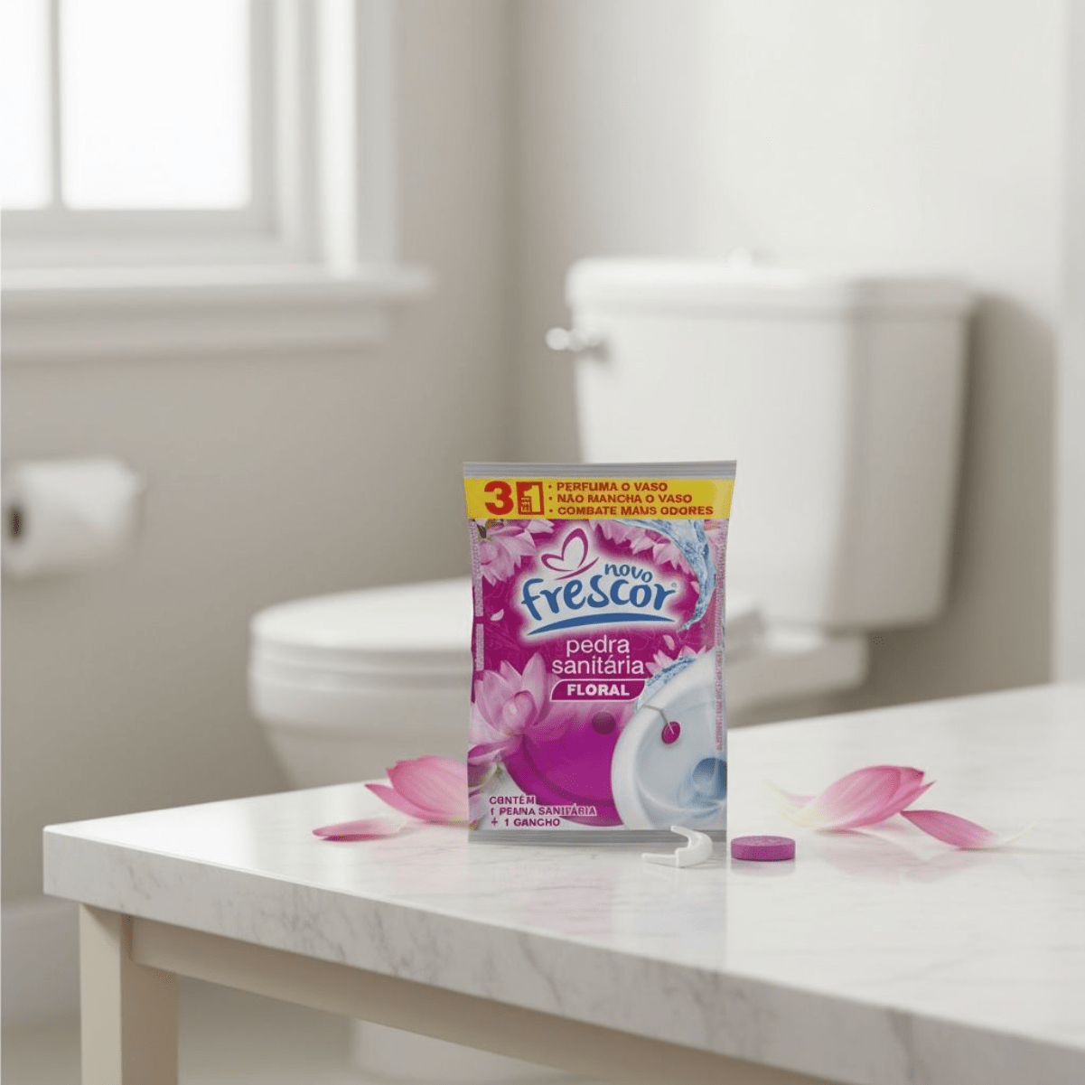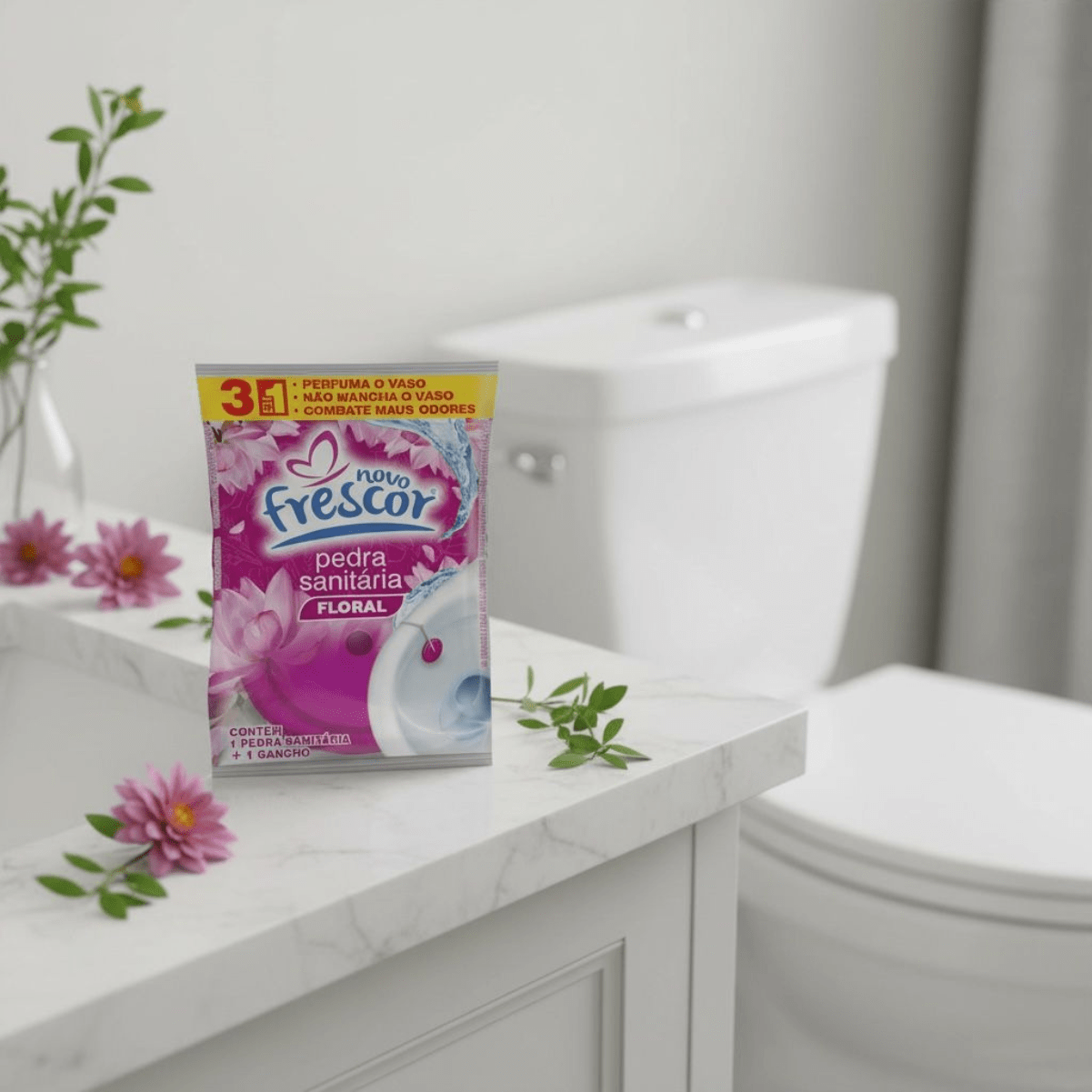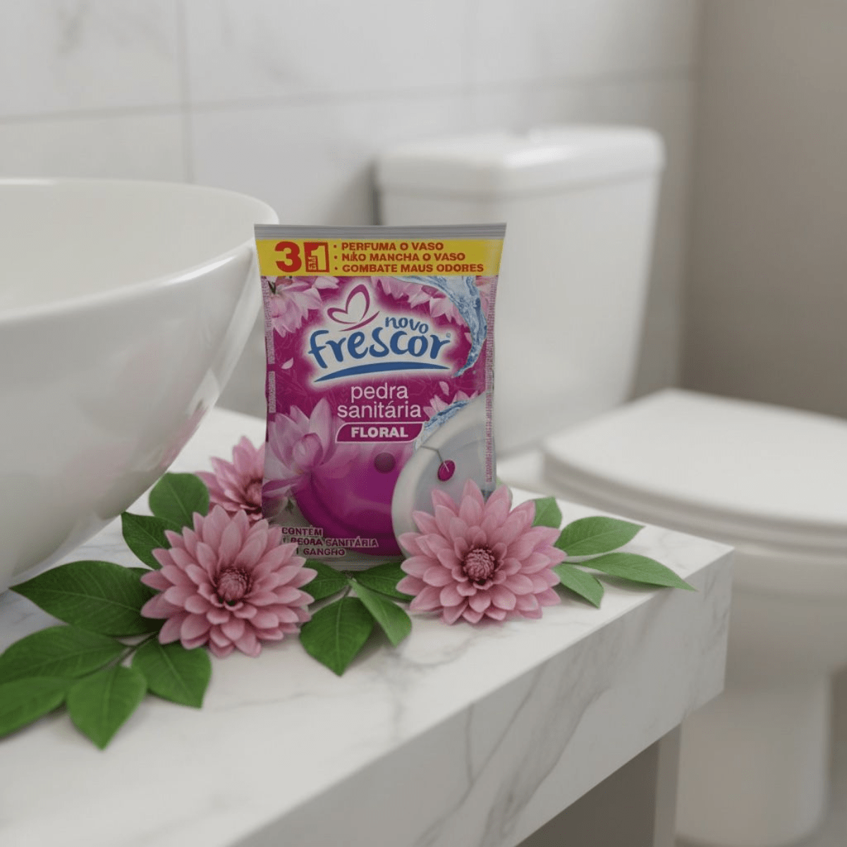 A Pedra Sanitária Floral Novo Frescor é um item tradicional, de altíssima rotatividade e indispensável no mix de higiene sanitária. Com ação 3 em 1 que perfuma o vaso, não mancha e combate os maus odores, entrega a clássica sensação de limpeza que o consumidor já conhece, confia e procura no ponto de venda. É um produto de recompra frequente, fácil de expor, com excelente giro e grande aceitação por parte dos consumidores.