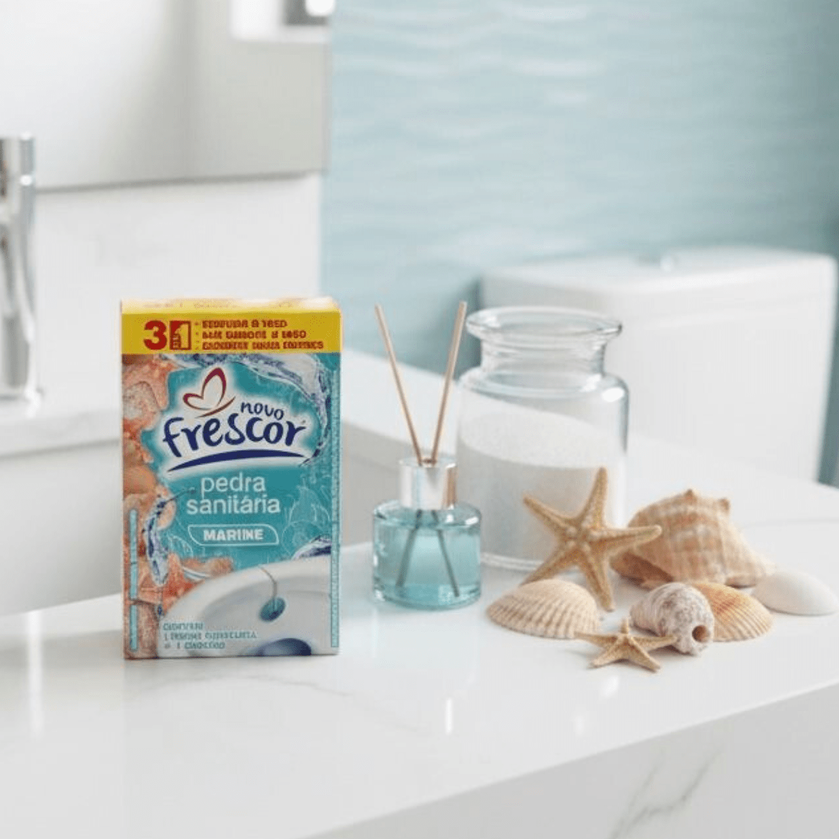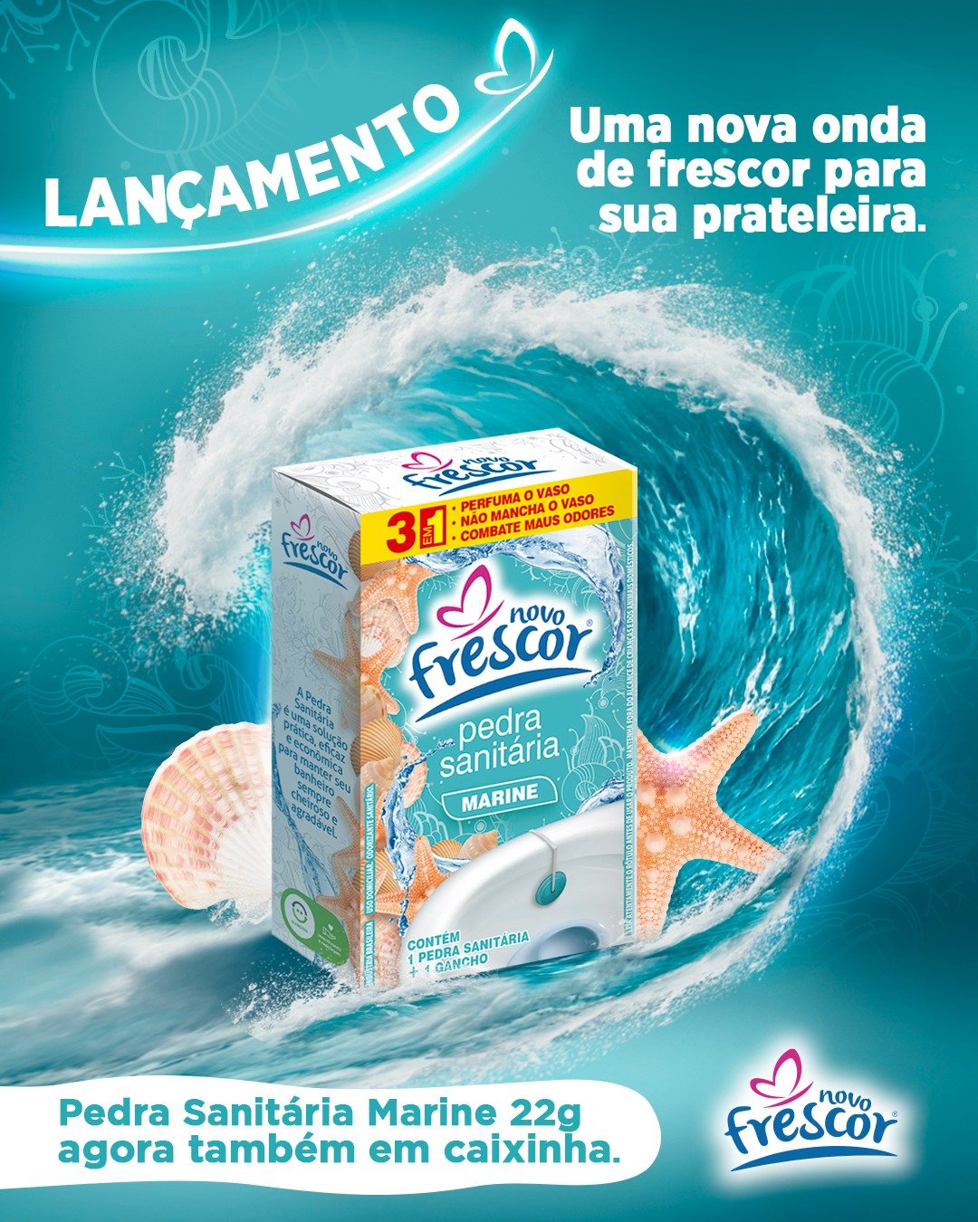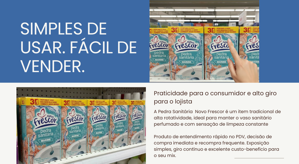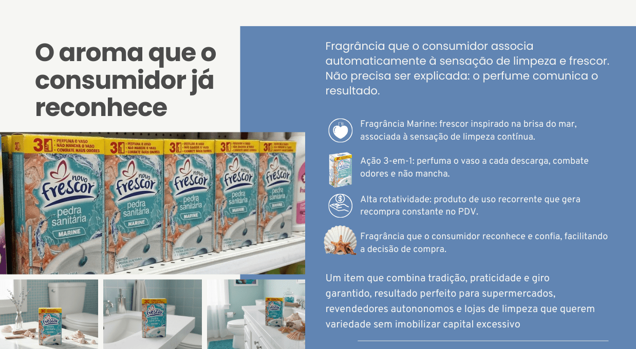Com fragrância marine refrescante e fórmula 3 em 1, a pedra sanitária perfuma o vaso sanitário, ajuda a combater maus odores e não mancha o vaso. Seu uso frequente gera recompra constante no ponto de venda, tornando-se um item essencial para supermercados, perfumarias e lojas de produtos de limpeza.