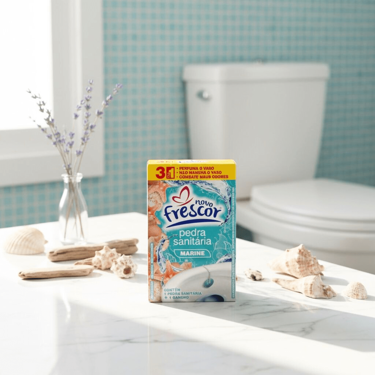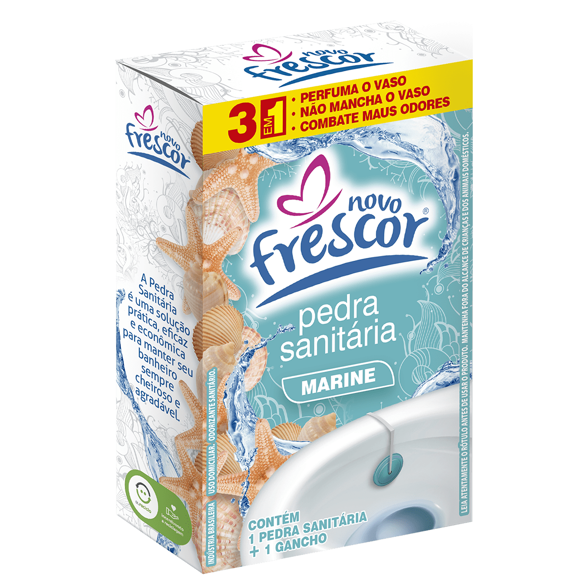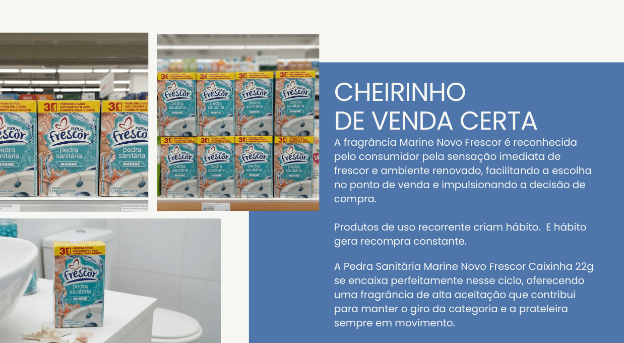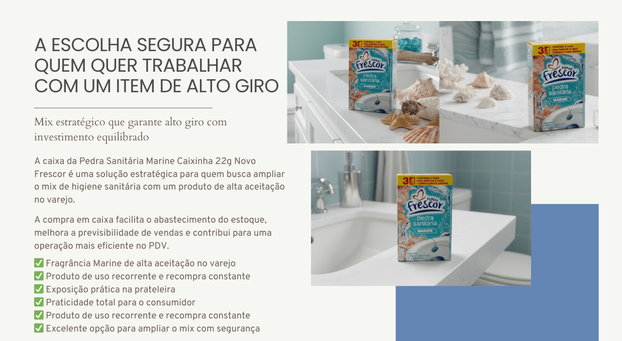 A Pedra Sanitária Marine Novo Frescor é um item tradicional da categoria de higiene sanitária, com entendimento rápido no PDV e decisão de compra imediata.