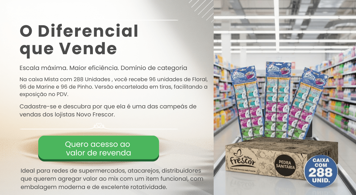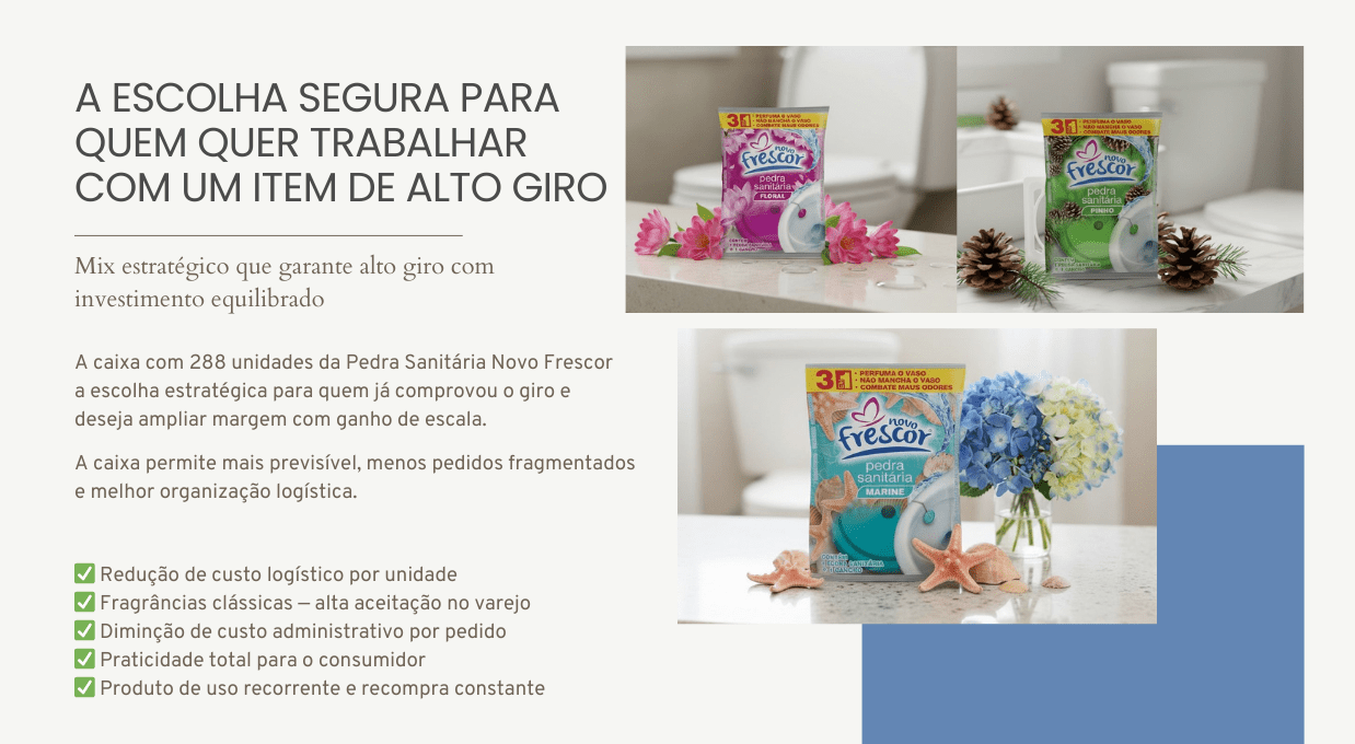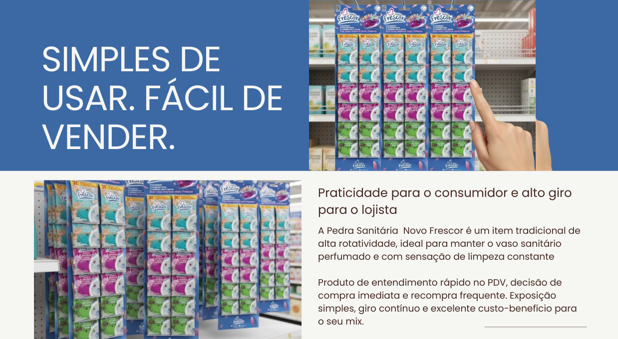 Disponível nas fragrâncias Pinho, Floral e Marine, a Pedra Sanitária Novo Frescor combina tradição, praticidade e eficiência em um produto de uso semanal — característica que gera hábito e impulsiona o giro no ponto de venda.