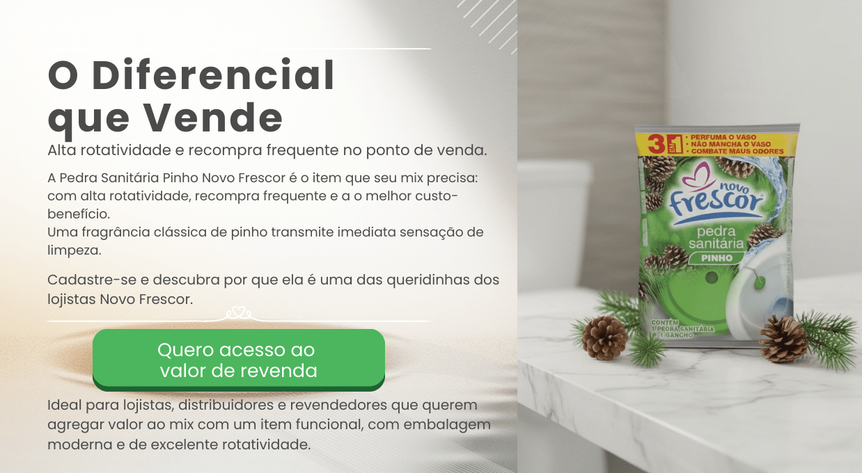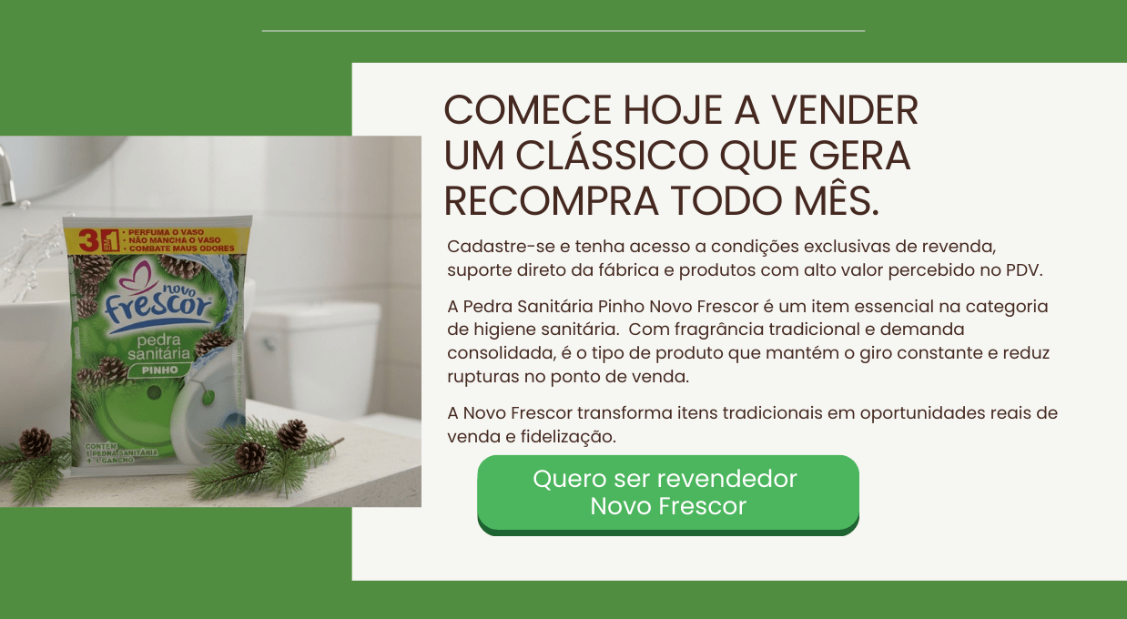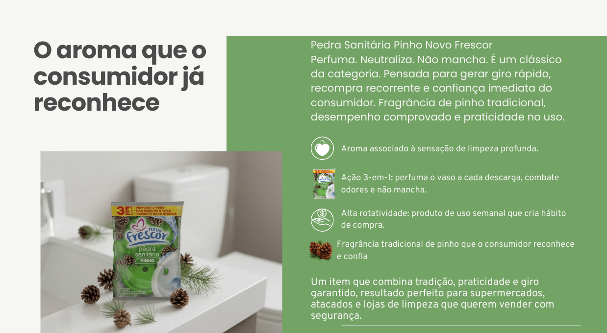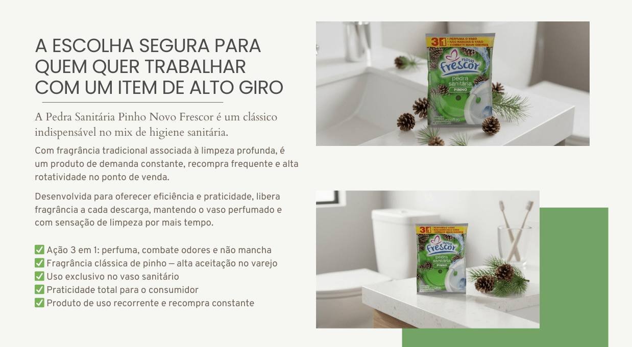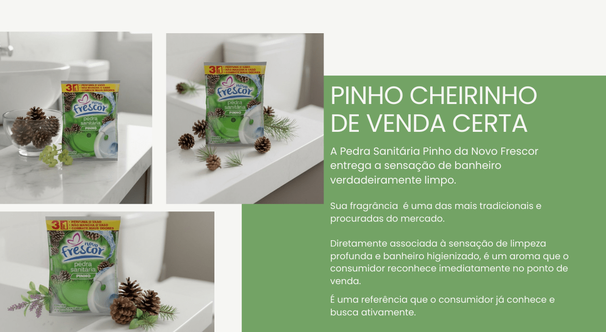 Integrando um mix estratégico de higiene sanitária, a Pedra Sanitária Pinho se posiciona como um dos destaques da linha Novo Frescor. A marca já é reconhecida por qualidade, performance e excelente custo-benefício, fortalecendo a presença no PDV e ampliando as oportunidades de vendas cruzadas na categoria.