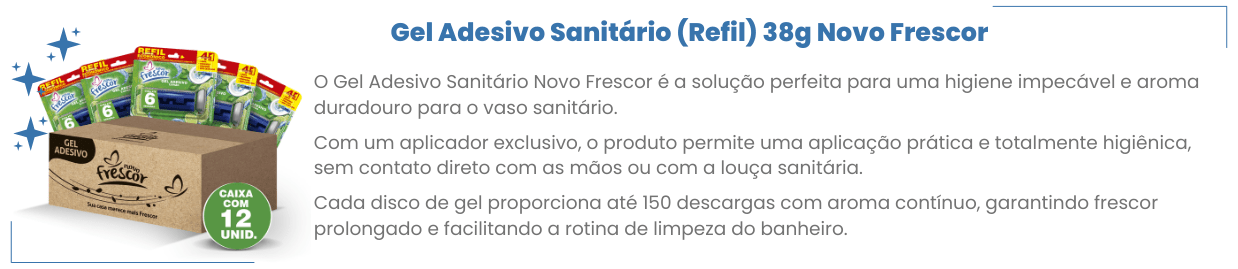 O Gel Adesivo Sanitário Novo Frescor também traz um aroma irresistível. E, essa linha foi cuidadosamente pensada para que nossos clientes tenham uma experiência inovadora sem precisar investir altos valores, e ainda entregar aos seus consumidores uma solução econômica e com alta eficiência, que proporcionará uma experiência sensorial encantadora.