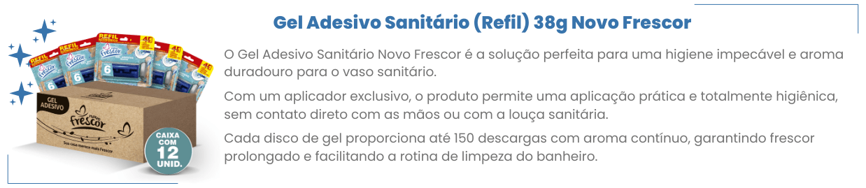 O Gel Adesivo Sanitário Novo Frescor também traz um aroma irresistível. E, essa linha foi cuidadosamente pensada para que nossos clientes tenham uma experiência inovadora sem precisar investir altos valores, e ainda entregar aos seus consumidores uma solução econômica e com alta eficiência, que proporcionará uma experiência sensorial encantadora.