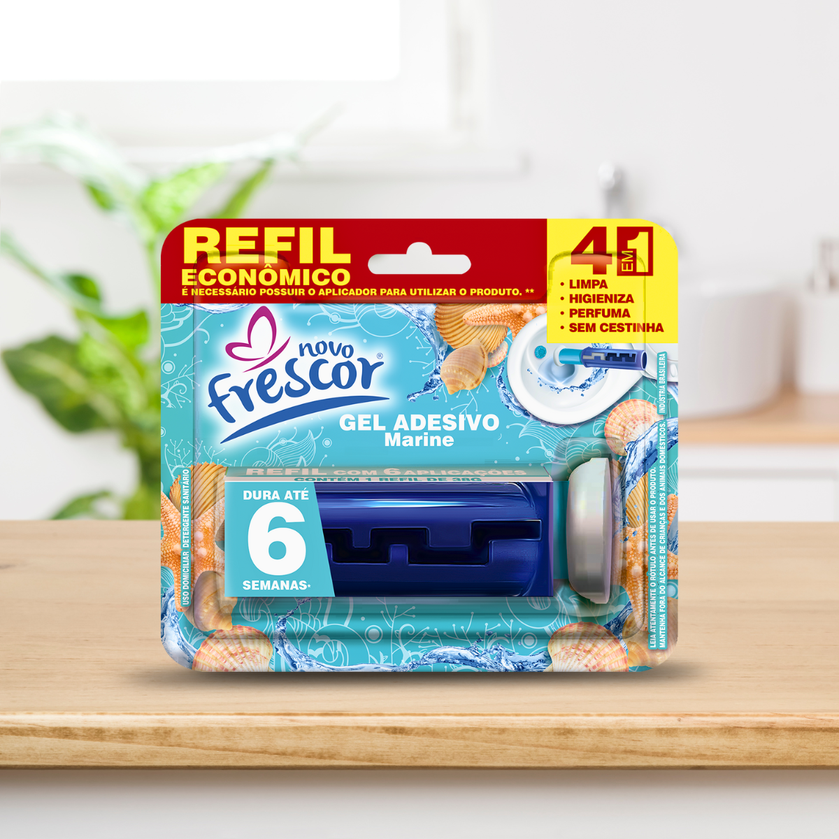 O Gel Adesivo Sanitário da Novo Frescor foi formulado com uma tecnologia, para que cada descarga seja uma experiência revigorante, deixando o vaso sanitário limpo, perfumado e com aquele frescor surpreendente. Além disso, ele é econômico e eficiente. Cada embalagem contém um refil com 6 aplicações de pura ação de limpeza, onde cada disco aplicado tem duração de até 150 descargas.